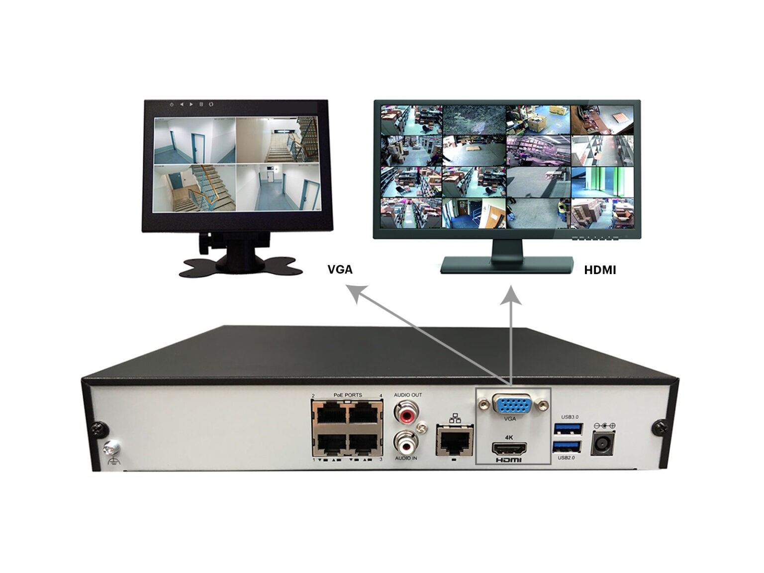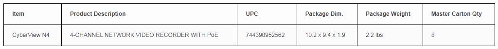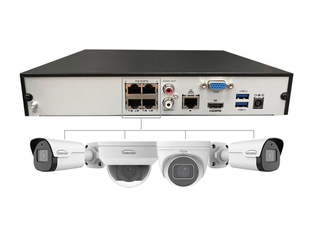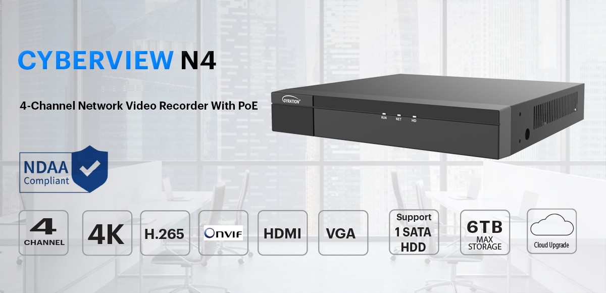 The Gyration CyberView N4 Network Video Recorder (NVR) supports up to four (4) IP cameras and provides up to 4K high-definition recording for your IP video surveillance applications. It is also compatible with Ultra 265, H.265, and H.264 video compression formats. The CyberView N4 is ideal for a variety of circumstances where image details are critical for identification, such as residential areas,