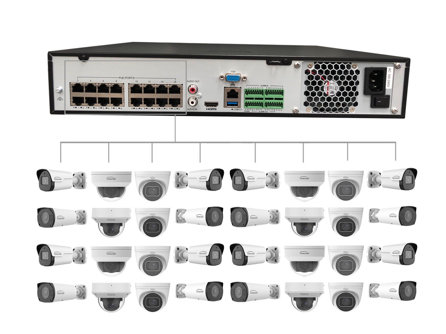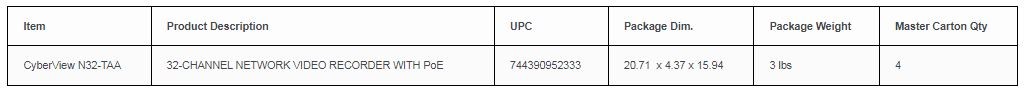 The Gyration Cyberview N32-TAA Network Video Recorder (NVR) supports up to 32 IP cameras and provides up to 4K high-definition recording for your IP video surveillance applications. It is also compatible with Ultra 265, H.265, and H.264 video compression formats. The CyberView N32 is ideal for a variety of circumstances where image details are critical for identification, such as residential areas, retail stores, businesses, office buildings, hotels, transportation hubs, and many more. The embedded programming allows for centralized management of your IP camera settings, including configuration, information import/export, real-time information display, two-way audio, firmware upgrades, etc.