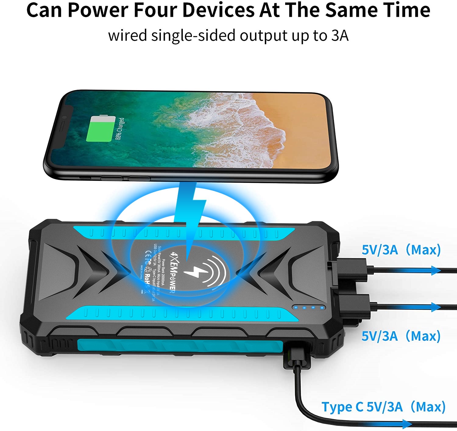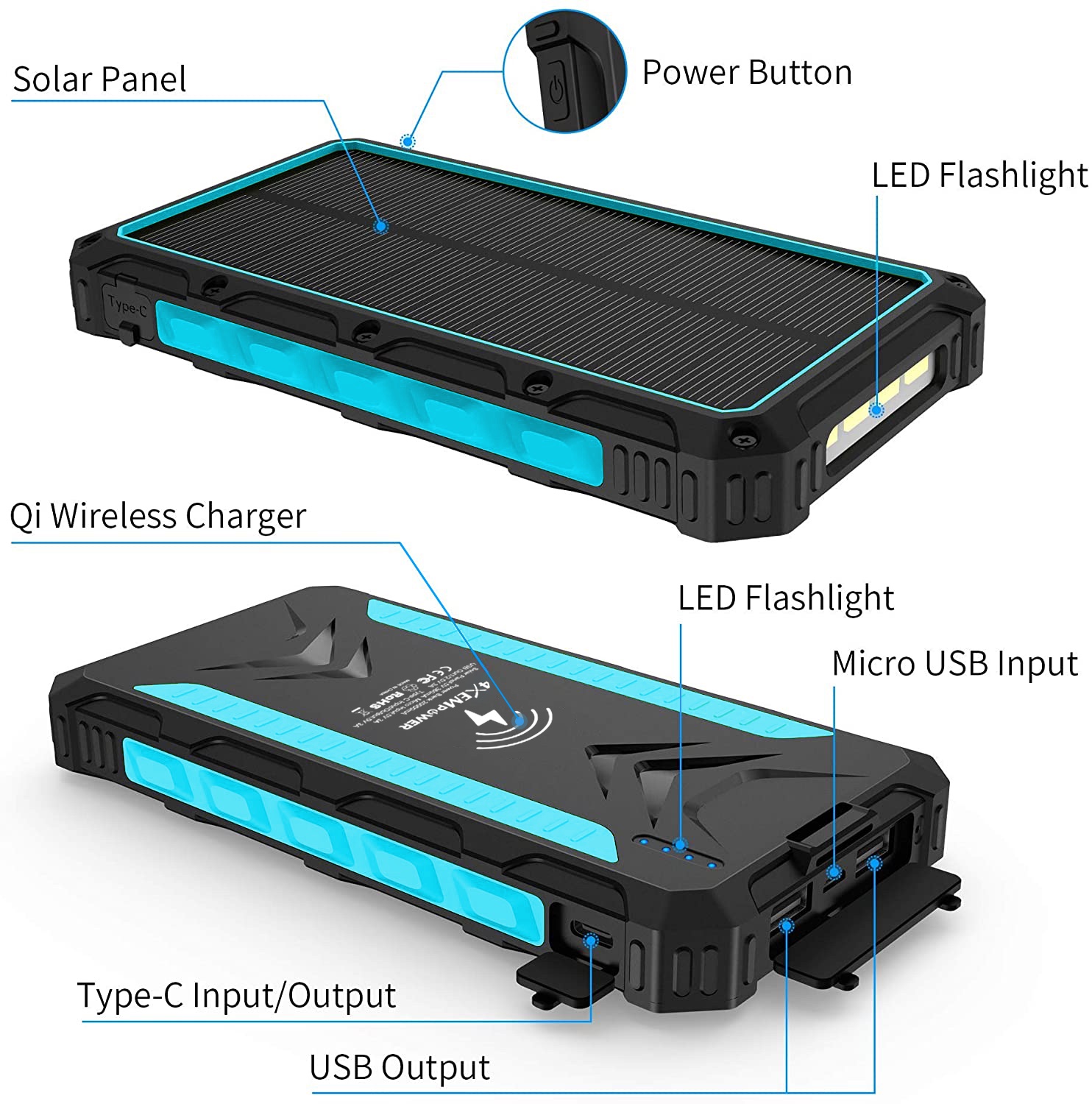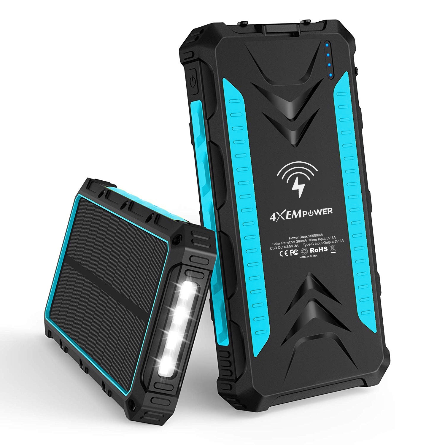 Containing a 20000mAh (milliamp hour) lithium-polymer power bank, the 4XEM Solar Charger charger all your Apple, Samsung, LG, Huawei and other mobile devices via solar energy or its USB ports.