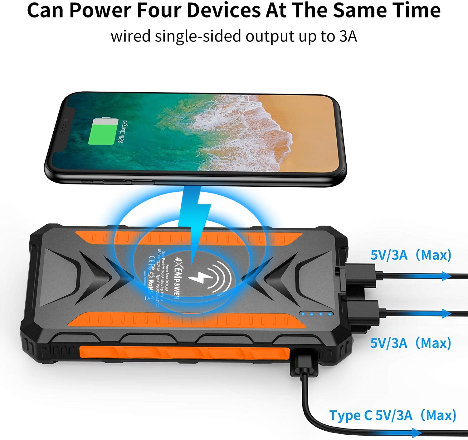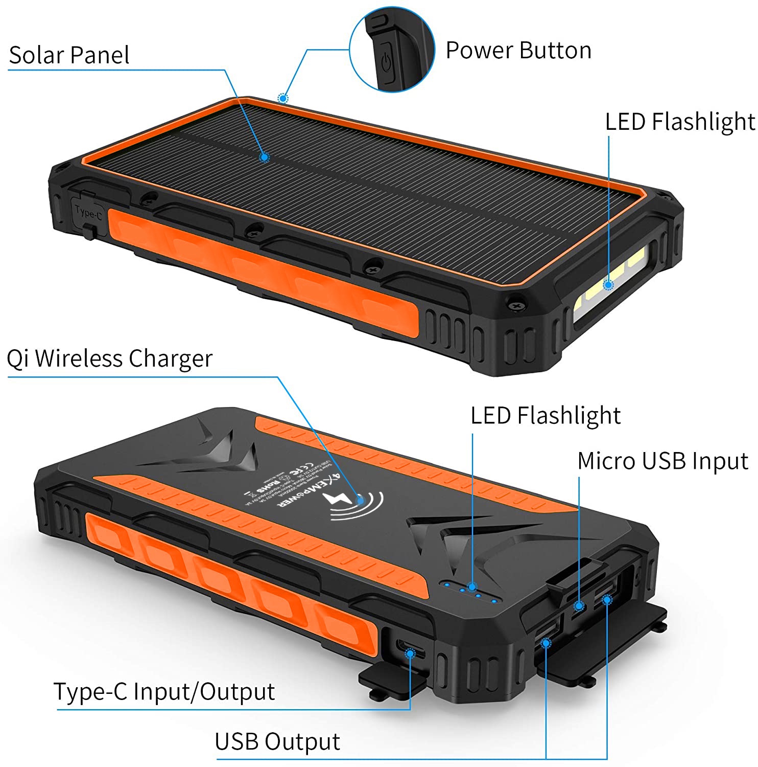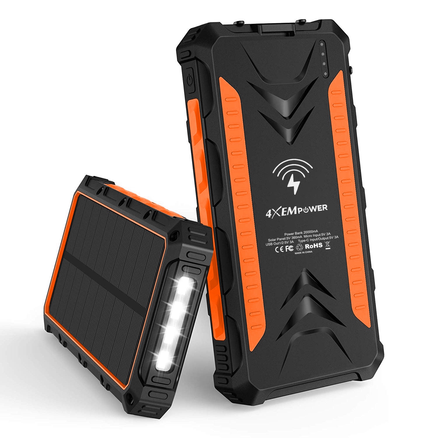 Containing a 20000mAh (milliamp hour) lithium-polymer power bank, the 4XEM Solar Charger charges all your Apple, Samsung, LG, Huawei and other mobile devices via solar energy or its USB ports.