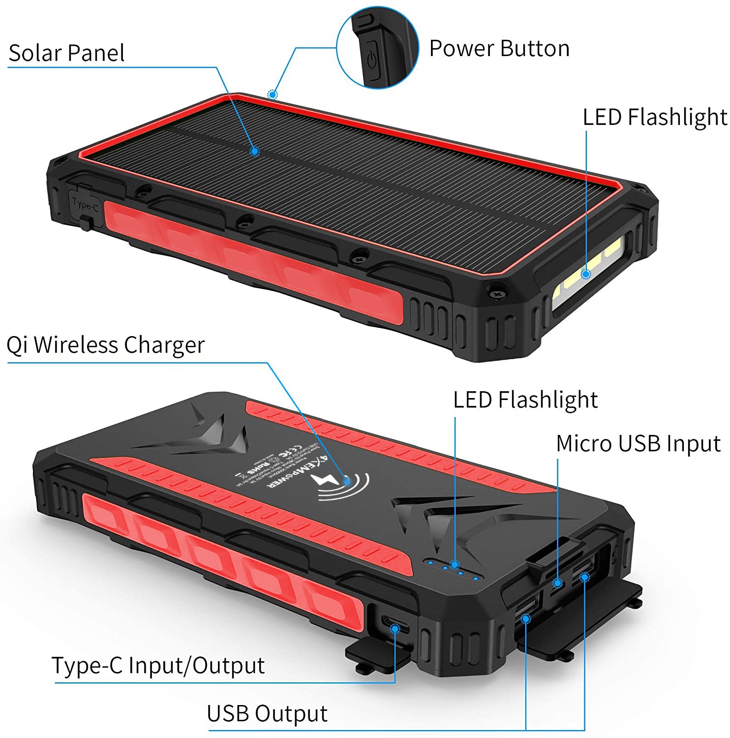 Containing a 20000mAh (milliamp hour) lithium-polymer power bank, the 4XEM Solar Charger charges all your Apple, Samsung, LG, Huawei and other mobile devices via solar energy or its USB ports.