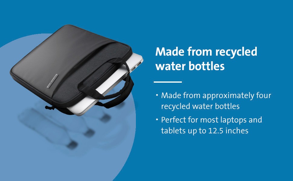 Made from recycled water bottles, the 12” Eco-Friendly Laptop Sleeve carrying case not only helps protect laptops and tablets from scratches, bumps, and drops, it helps protect the planet. Perfect for most laptops and tablets up to 12.5 inches (see product specications for sleeve dimensions). Exterior storage pockets keep accessories and adapters stowed and protected when not in use, while helping to avoid accidentally scratching or damaging the laptop. Adjustable shoulder strap and integrated handle offer multiple carry options. Premium zippers and stitching are built to last.