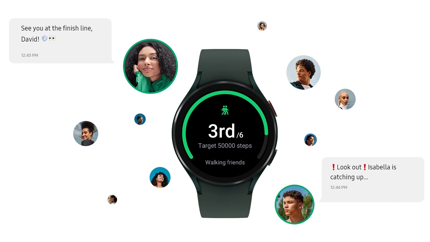 Enjoy every step you take with your friends and family with the Galaxy Watch4. Track your steps and compete with friends through a live message board. Challenges come with commemorative badges and a point system to make exercise fun, motivating and socially rewarding.