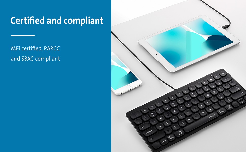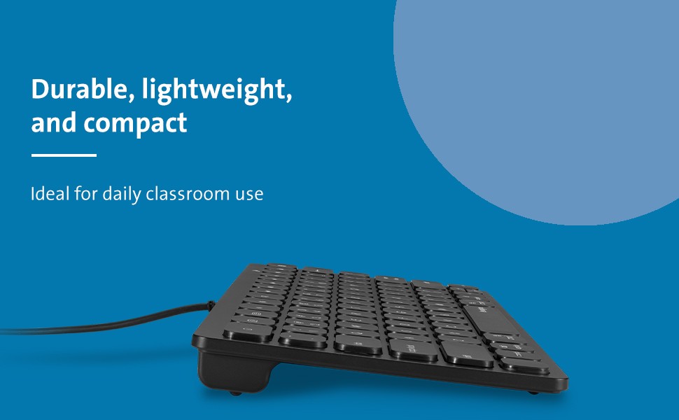 The Simple Solutions™ Wired Compact Keyboard with Lightning Connector is the ideal classroom plug-and-play iPad keyboard. Features include fullsize, responsive scissor keys for a comfortable and precise typing experience; 14 shortcut keys to quickly navigate common iOS keyboard commands; durable, lightweight, compact design; and a caps lock LED indicator. Wired Apple Lightning connection delivers reliable performance without the need for batteries or charging; MFi certied to work with Apple iPads and iPhones with a Lightning Connector.