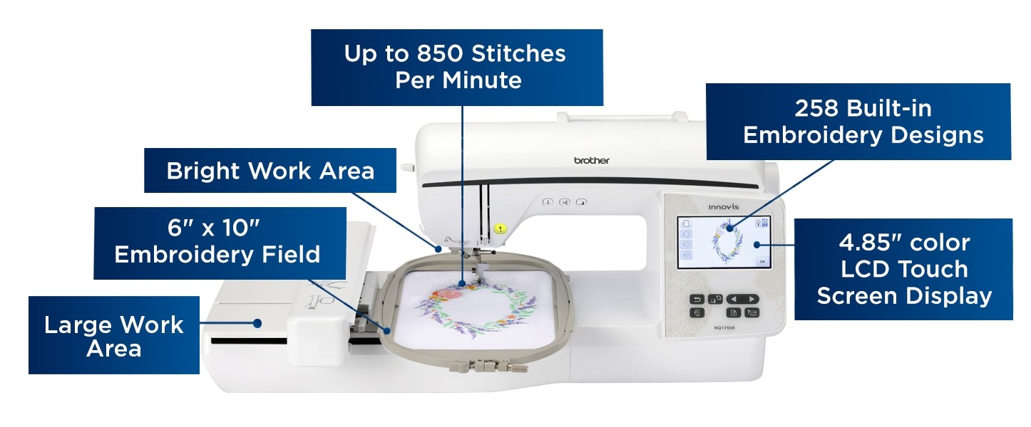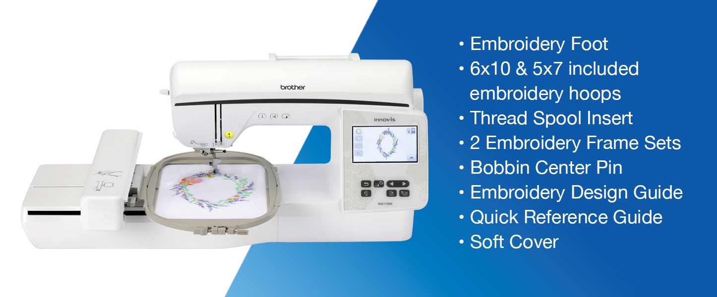 The sleek white NQ1700E comes with over 250 built-in embroidery designs, a host of innovative features such as an Auto Presser Foot (down to start), easy bobbin winding, and an automatic thread cutter you’ll be creating as soon as you open the box.