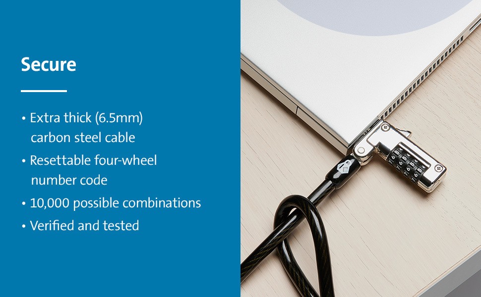 Ideal for thin laptops with a nano slot, the Slim NanoSaver® Combination Ultra Cable Lock offers our highest level of protection against cutting attempts, while allowing the laptop to lie flat and stable, and without blocking valuable ports. Extra-thick (6.5mm) six-foot carbon steel cable is sheathed in an anti-shearing plastic sleeve that resists cuts and protects surfaces. Features include a resettable four-number combination; one-handed operation; and Register & Retrieve™ for quick, secure, and easy combination retrieval. Meets or exceeds rigorous strength testing standards. From Kensington, inventor of the laptop cable lock, and industry leader in physical device security for more than 25 years.