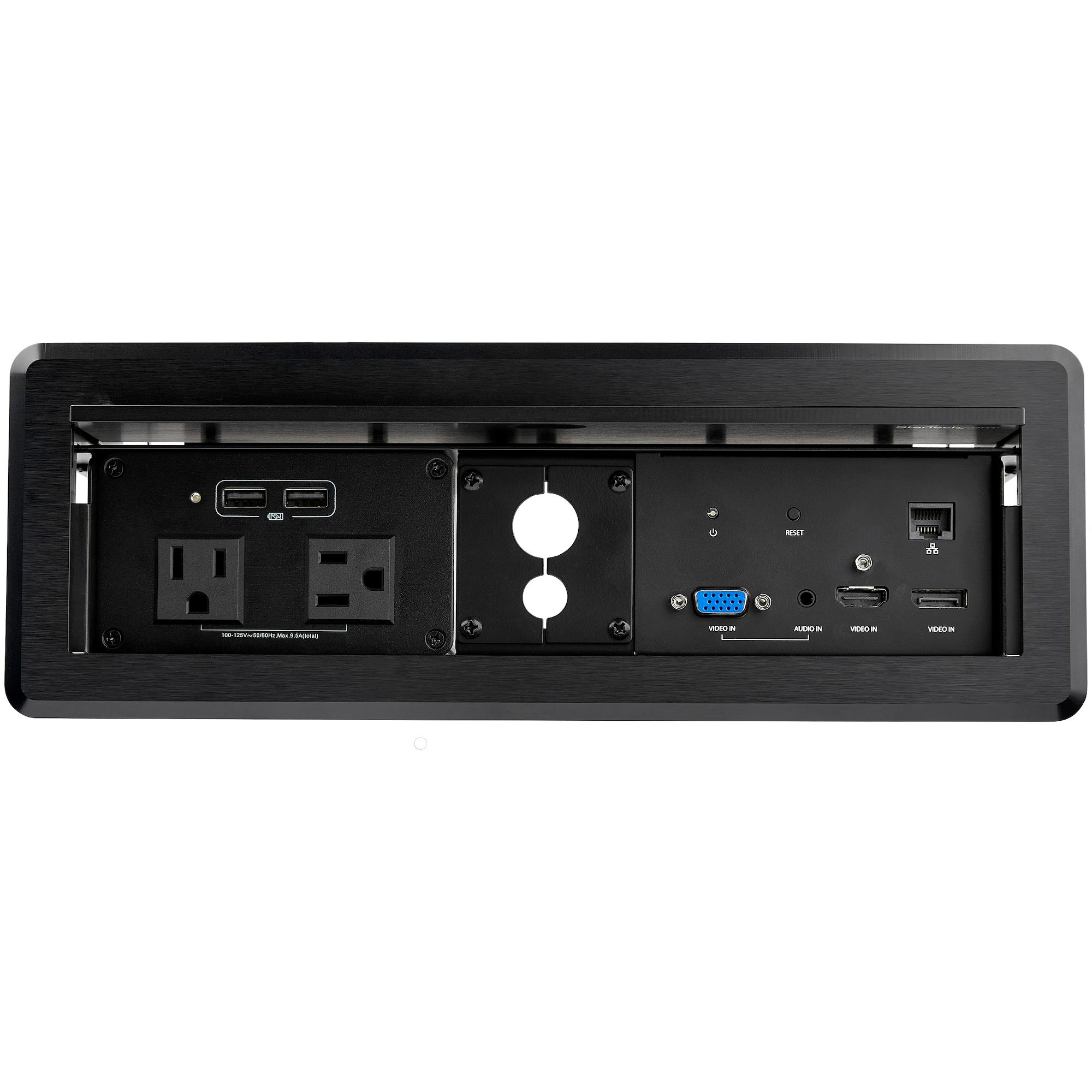 The conference table insert is easy to install and features a lid that closes to conceal connection points. The cable organizer keeps cable accessible.