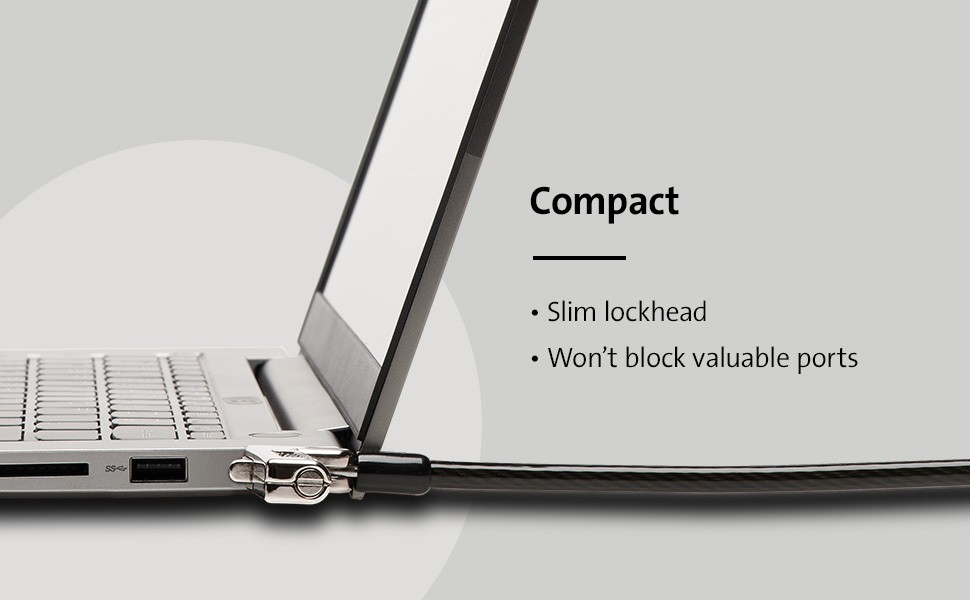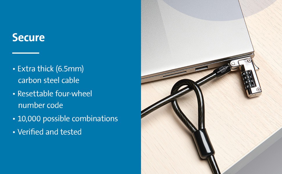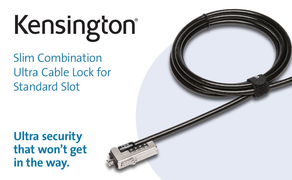 Ideal for thin laptops, the Slim Combination Ultra Cable Lock for Standard Slot offers our highest level of protection against cutting attempts, while allowing the laptop to lie flat and stable, and without blocking valuable ports. Extra-thick (6.5mm) six-foot carbon steel cable is sheathed in an anti-shearing plastic sleeve that resists cuts and protects surfaces. Features include a resettable four-number combination; one-handed operation; and Register & Retrieve™ for quick, secure, and easy combination retrieval. Meets or exceeds rigorous strength testing standards. From Kensington, inventor of the laptop cable lock, and industry leader in physical device security for more than 25 years.