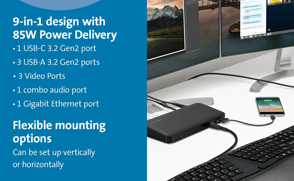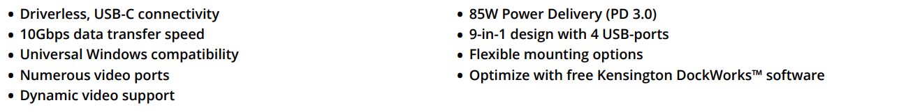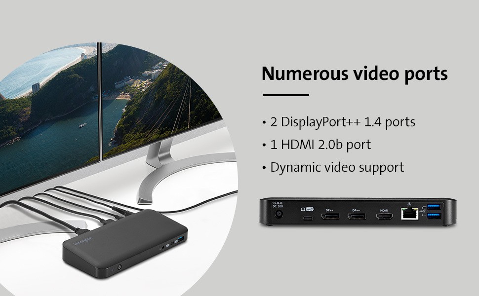 Expand your productivity with the SD4840P USB-C 10Gbps Triple Video Driverless Docking Station. Features include two DisplayPort++ 1.4 ports, one HDMI 2.0b port; support for a minimum resolution of Single 4K @ 30Hz, Dual 1080p @ 60Hz, and Triple 1080p @ 30Hz when connected to a DP1.2/HBR2 device, and a maximum resolution of Single 5K @ 60Hz, Dual 4K @ 60Hz, and Triple 4K at 30Hz when connected to a DP1.4 HBR3 DSC device; one USB-C 3.2 Gen2 port; three USB-A 3.2 Gen2 ports; a combo audio port; a Gigabit Ethernet port; flexible mounting options; and optimized performance with free Kensington DockWorks™ software.
