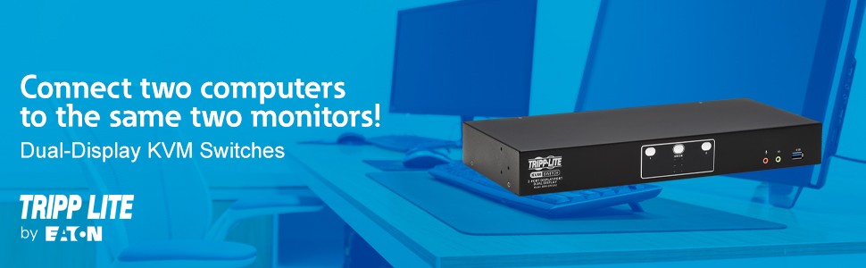 The B006-DP2UA2 Dual-Display KVM Switch allows you to access and control two DisplayPort-enabled computers and switch back and forth between them. Both computers share two monitors and one keyboard/mouse, saving space on your desk or workspace. It’s the perfect solution for work-from-home applications in which your home and work computers are side by side.