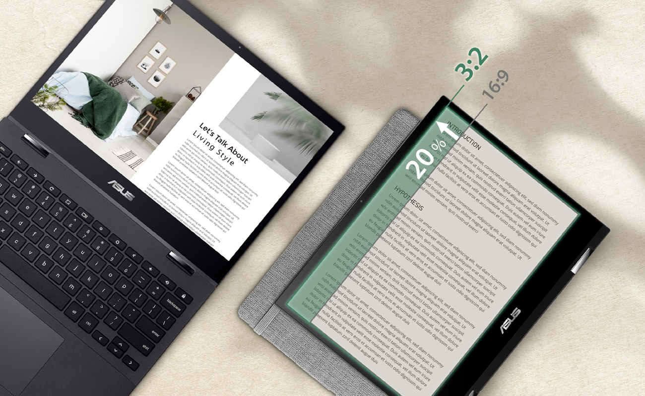 ASUS Chromebook Flip CM3 offers a display with an incredible 3:2 aspect ratio and narrow bezels for a larger screen that provides 20% 3 more screen space in the portrait position. This display is nearly the size of an A4 piece of paper and delivers pure enjoyment while reading, browsing the web and taking notes with more immersive viewing and less scrolling.