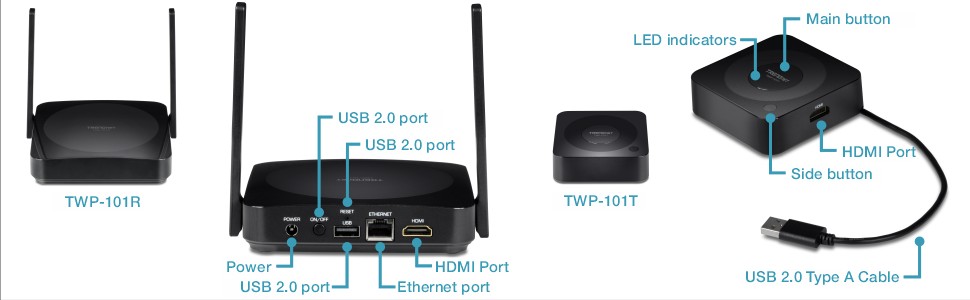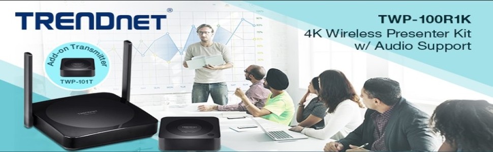 TRENDnet’s 4K Wireless Presenter Kit with Audio Support, model TWP-100R1K, is a reliable wireless presentation solution that offers efficiency and clarity for business meetings, school classrooms and lecture halls, and homes. This wireless presentation system supports multiple devices simultaneously and it is compatible across multiple platforms. Easy plug-and-play setup makes presentations possible with just one click. The TWP-100R1K wireless presentation system receives high-quality images over several types of devices (desktop, laptop, tablet, and phone). TRENDnet’s wireless presentation solution is ideal for both business and home use.