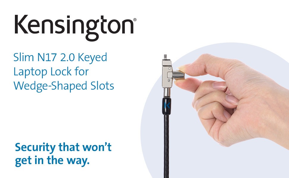 Tested and approved by Dell, the Slim N17 2.0 Keyed Laptop Lock for Wedge-Shaped Slots is perfect for ultra-thin and 2-in-1 laptops since it won’t block valuable ports, and allows the laptop to lie flat and stable. Meets or exceeds rigorous strength testing standards. Features six-foot (1.8m) carbon steel cable with omnidirectional pivoting head and rotating anchor, 5mm keying system, and free Register & Retrieve™ key registration and replacement. From Kensington, inventor of the laptop cable lock, and industry leader in physical device security for more than 25 years.
