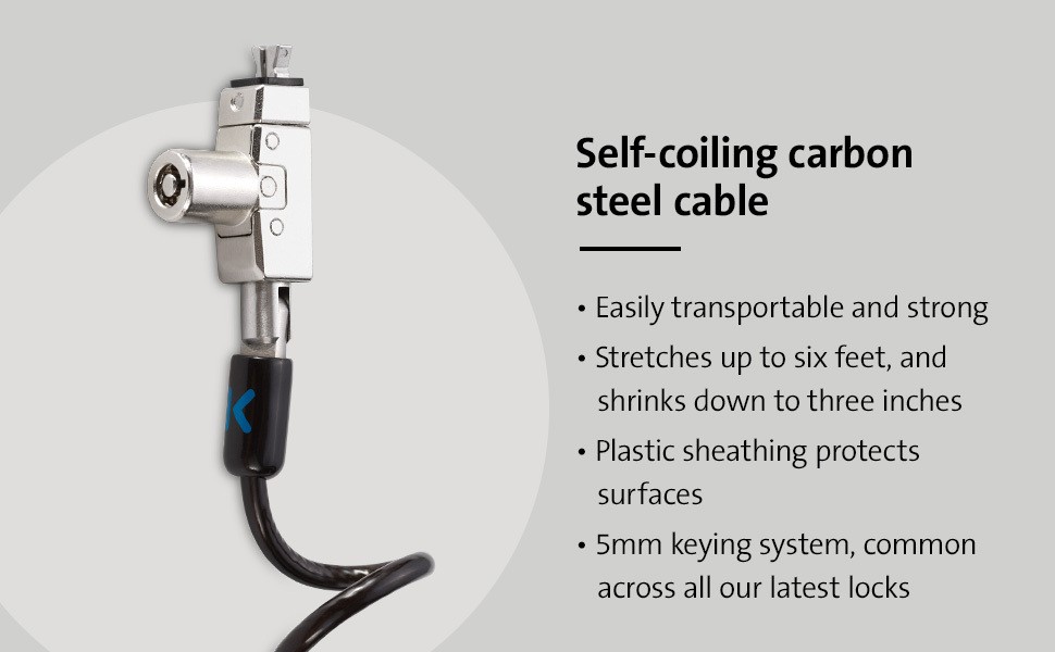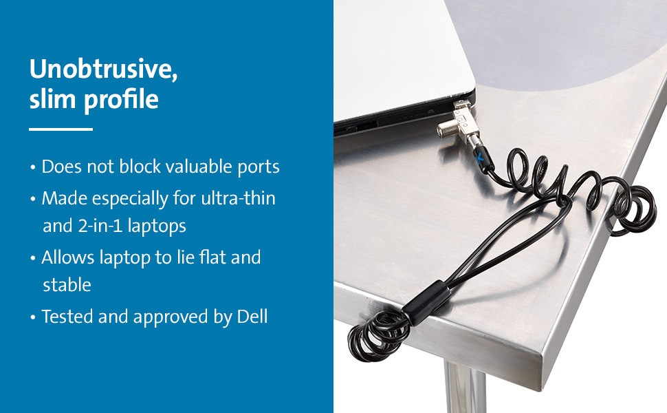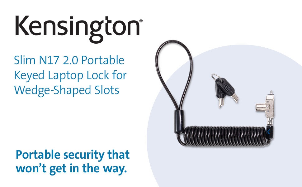 Tested and approved by Dell, the Slim N17 2.0 Portable Keyed Laptop Lock for Wedge-Shaped Slots is the perfect portable lock for Dell ultra-thin and 2-in-1 laptops since it won’t block valuable ports, and allows the laptop to lie flat and stable. Self-coiling carbon steel cable sheathed in plastic stretches up to six feet and shrinks down to three inches. Meets or exceeds rigorous strength testing standards. Features an omnidirectional pivoting head and rotating anchor, 5mm keying system, and free Register & Retrieve™ key registration and replacement. From Kensington, inventor of the laptop cable lock, and industry leader in physical device security for more than 25 years.