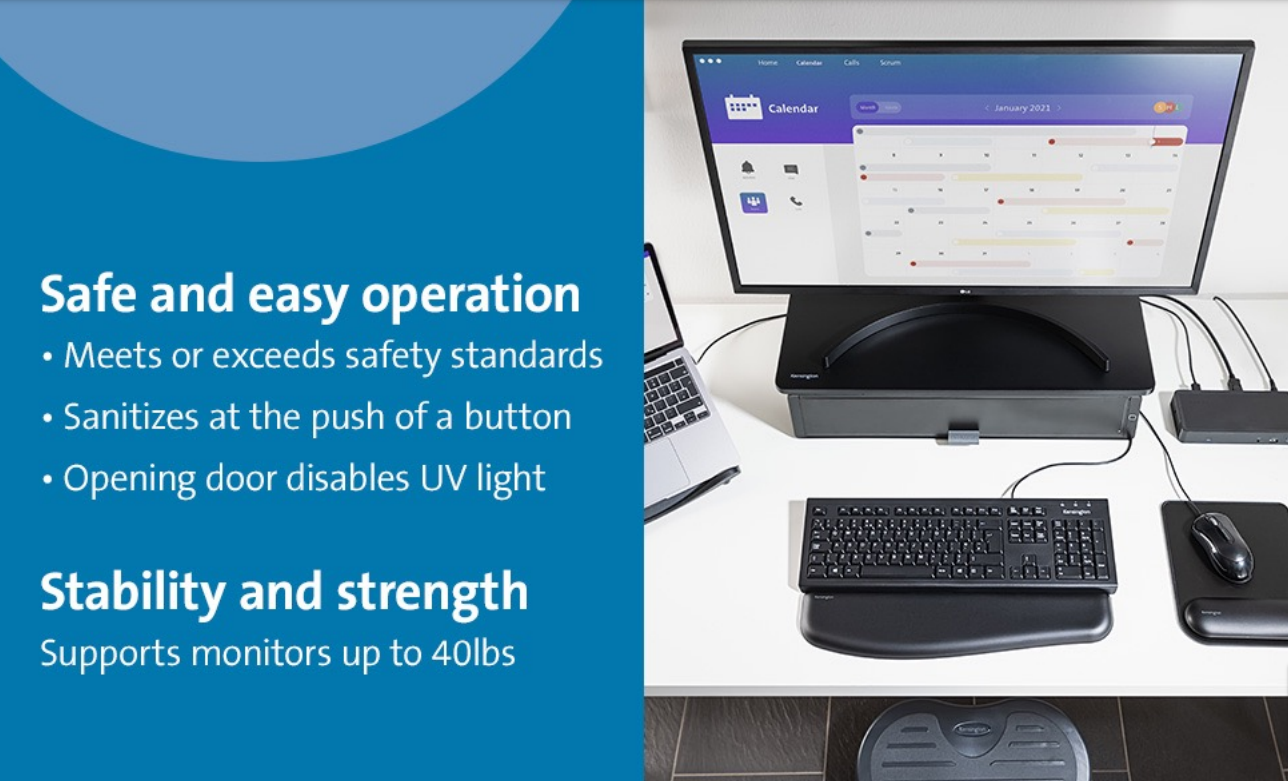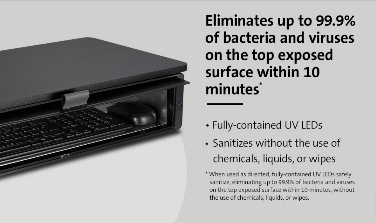When used as directed, the UVStand⢠Monitor Stand with UV Sanitization Compartment safely, easily, and efficiently helps to sanitize keyboards, mice, trackballs, mobile phones, and other devices, while promoting healthy posture and optimal comfort. The spacious sanitization compartment accepts most full-sized keyboards in addition to other devices, and can be used to store desktop items when not sanitizing, for a more clutter-free desktop.