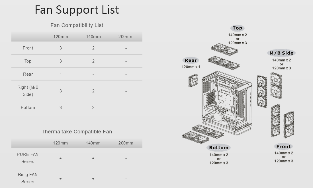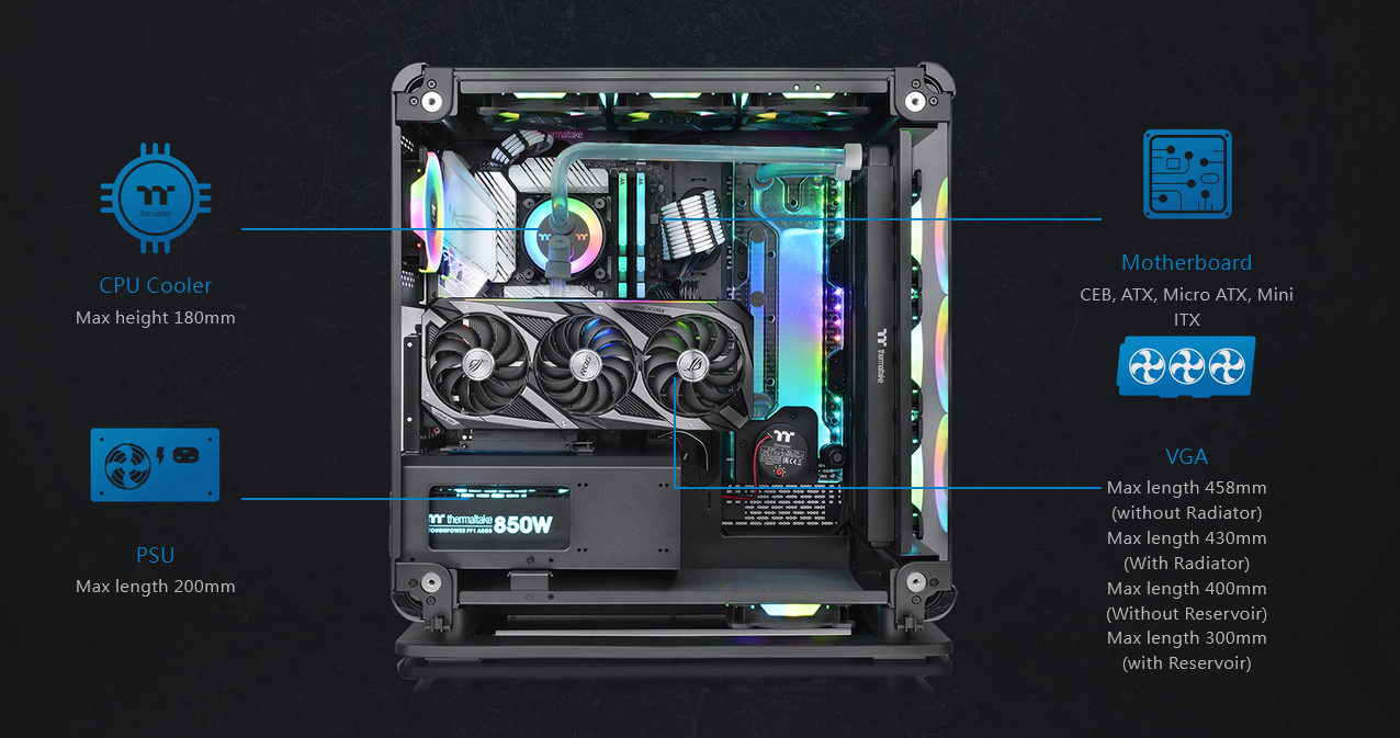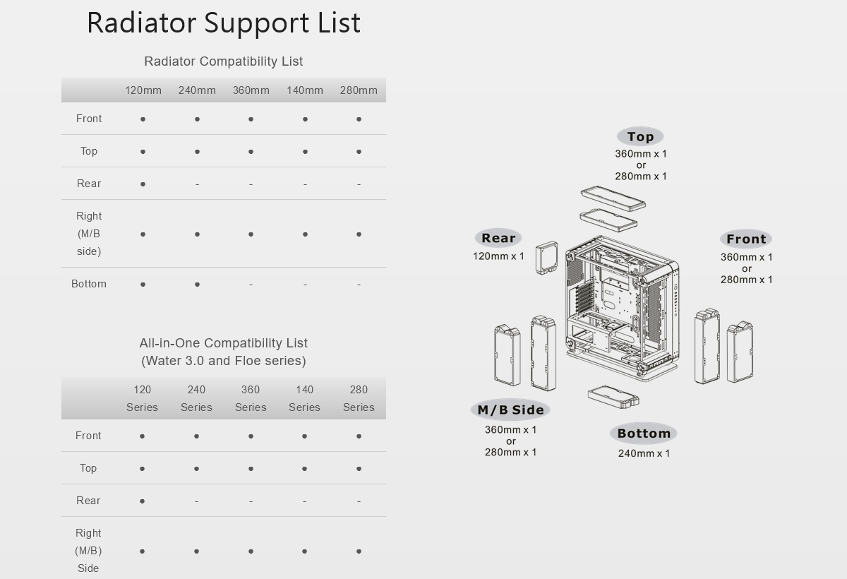 The Core P6 TG has excellent expandability which helps users build a complete thermal solution. It can support up to a CEB motherboard, a CPU cooler with a maximum height of 180mm, two-way VGA placements of up to 458mm in length (without radiator), a power supply with a length of up to 200mm, and up to eight 2.5” SSD or four 3.5” HDD. When it comes to cooling solutions, the Core P6 TG is optimized for air cooling and advanced AIO/DIY liquid cooling components as well. You can either house up to thirteen 120mm or eight 140mm fans in total. Additionally, the case can fit 360mm or 280mm radiators at the front, top, and right side of the motherboard. With the remarkable hardware expansion and liquid cooling support, the Core P6 TG has endless possibilities for users to build their dream machine.