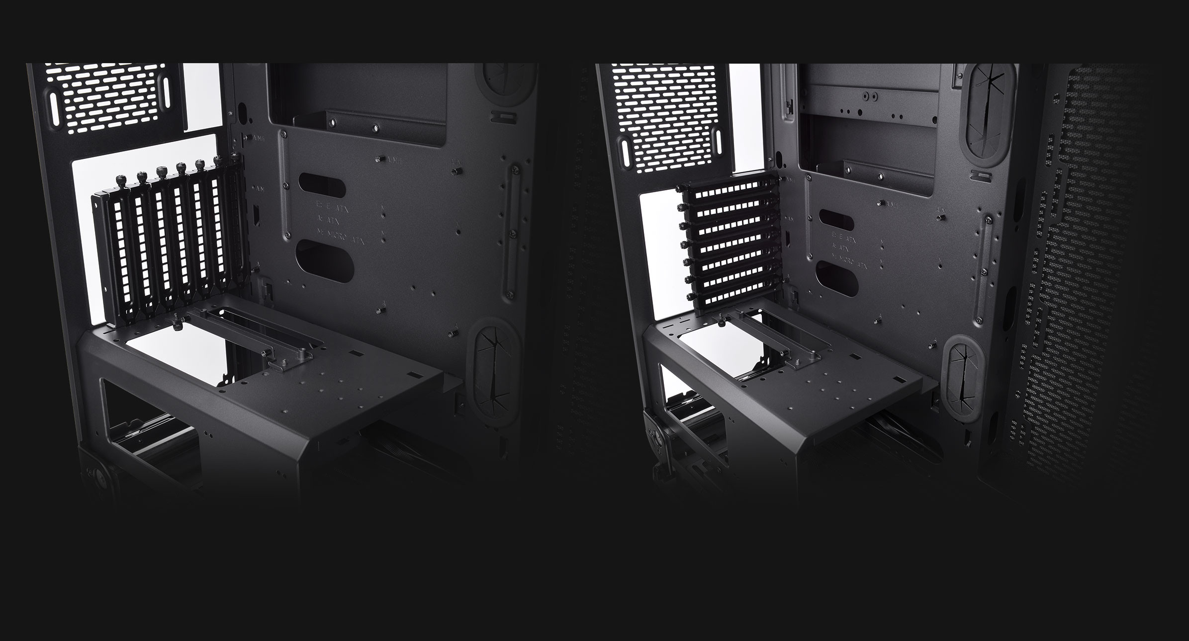The built-in PSU cover is designed to hide unsightly cables with overall good ventilation. The Riser Cable bracket on top of the PSU cover and an extra L-shape GPU bracket in the accessory box not onlyenable vertical GPU installation, but help reduce the weight on the PCI-E slots, especially wheninstalling high-end graphics cards like NVIDIA GEFORCE RTX Series and AMD Radeon™ RX Series.Additionally, the extra GPU bracket can be used to hold vertical and horizontal placed GPUs andusers can install the bracket in three ways based on their needs
