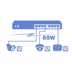 A 65W PoE power budget supports up to eight Power over Ethernet devices.