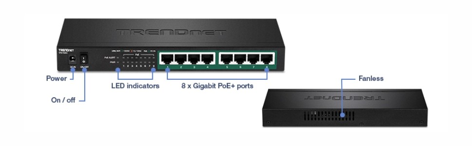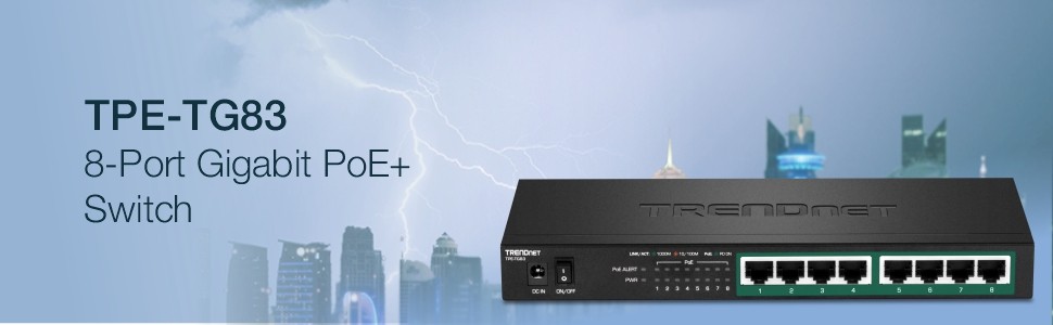 TRENDnet's 8-Port Gigabit PoE+ Switch, model TPE-TG83, reduces equipment and installation costs by delivering data and power over existing Ethernet cables. With PoE technology, users only need one set of cables to deliver both data and power. This compact network switch provides eight gigabit PoE+ ports with a total PoE power budget of 65W. The TPE-TG83 PoE+ switch allows you to network PoE devices, such as wireless access points, IP cameras, VoIP phones, IP video encoders, access controls, and more. It features a fanless design, and has a convenient option for wall mounting.