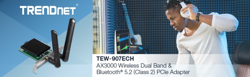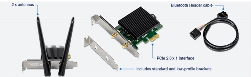TRENDnet's AX3000 Wireless Dual Band & Bluetooth 5.2 (Class 2) PCIe Adapter, model TEW-907ECH, simultaneously provides Bluetooth and WiFi connections, allowing you to concurrently connect to a WiFi network and Bluetooth devices. Conveniently download music, videos, and pictures from a wireless internet connection, and then transfer those same files seamlessly to your Bluetooth-enabled phone or device. This WiFi Bluetooth PCIe card instantly upgrades a standard or low-profile Windows® computer to Wireless AX3000 & Bluetooth 5.2 (Class 2). Quickly connect to a high-performance Wireless AX network at 2401Mbps or to a Wireless N network at 600Mbps. For extended range, use our magnetic antenna base, TEW-LB101 (sold separately), with the WiFi Bluetooth PCIe card to relocate antennas for optimal signal coverage.