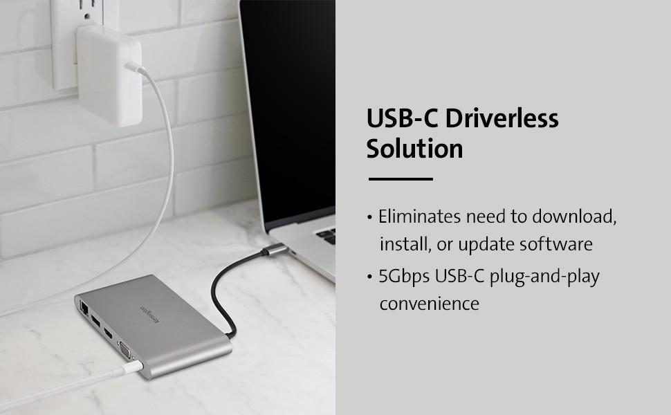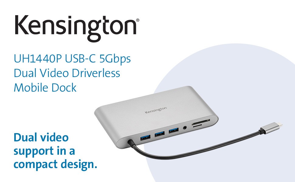 With more people connected to multiple monitors, along with more people working between different locations with different monitors, a compact, mobile dock is required that can accommodate setups which often involve legacy equipment. The UH1440P USB-C 5Gbps Dual Video Driverless Mobile Dock makes the most of legacy monitors, allowing you to connect up to two DP/HDMI and/ or DP/VGA monitors. A single monitor (up to 4K @ 60Hz) is supported on macOS, iPadOS and Samsung DeX®. macOS supports dual extended monitors in mirrored mode only. This USB-C driverless dock supports up to 85W power pass-through, letting you use your laptop’s USB-C power supply to charge your laptop while also powering the dock. 10-in-1 design includes three USB-A ports, a 3.5mm combo audio jack, Micro and SD card slots, and one Gigabit Ethernet port.