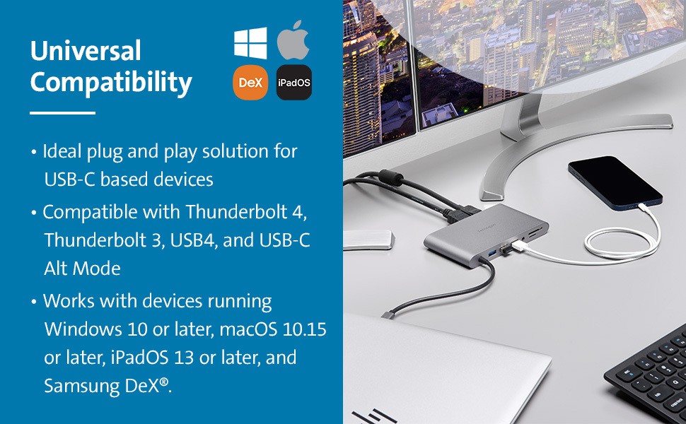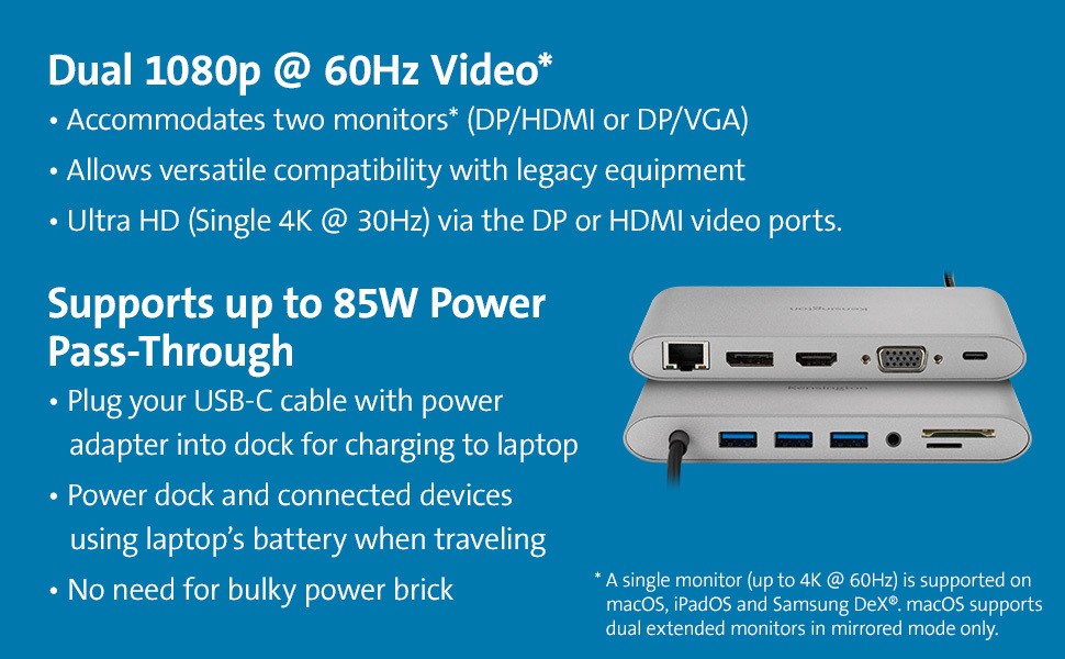 * A single monitor (up to 4K @ 60Hz) is supported on macOS, iPadOS and Samsung DeX®. macOS supports dual extended monitors in mirrored mode only.