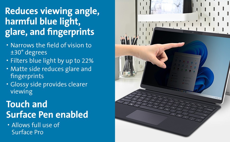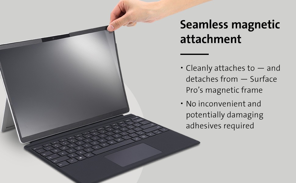 The move toward hybrid working means that the modern workplace is no longer a single, easy-to-secure location. Users can be working anywhere, with an increased chance of visual hacking. Owners of the Surface Pro 8 require a privacy screen that can be quickly attached and detached, allowing the laptop to close completely to enter sleep mode. The MagPro™ Elite Magnetic Privacy Screen attaches seamlessly to the Surface Pro’s magnetic frame, requiring no inconvenient adhesives. Allowing the device to close completely, the screen narrows the viewing angle to ±30°, limiting the chance of unauthorized viewing and reducing harmful blue light and glare.