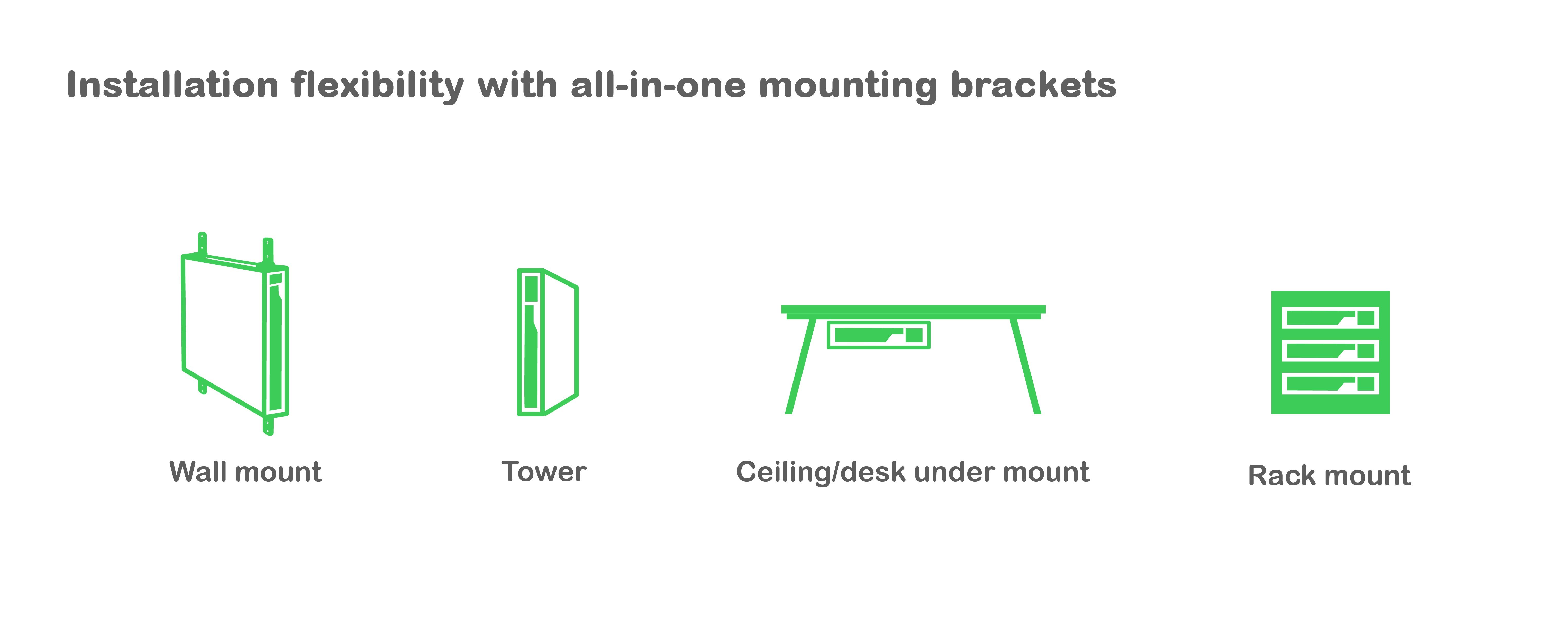 1U design saves valuable space for IT. 5 mounting styles: rack, tower, wall, ceiling, and desk under mount