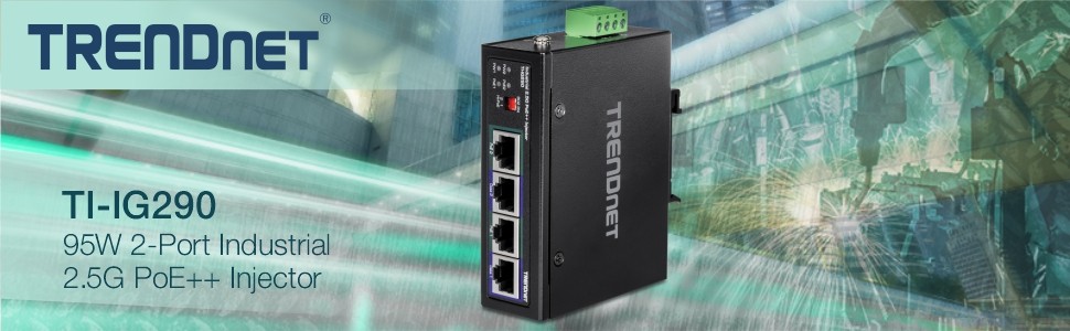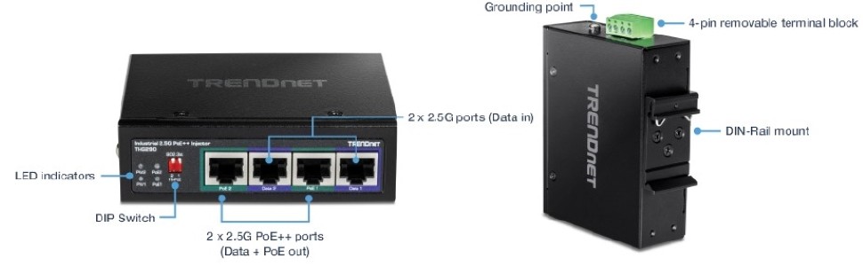 TRENDnet’s 95W 2-Port Industrial 2.5G PoE++ Injector, model TI-IG290, allows users to add PoE++ power to a non-PoE 2.5G switch. Connect the 2-port industrial 2.5G PoE++ injector to a non-PoE 2.5G switch, and then run Ethernet cables up to 100 meters (328 ft.) to network two PoE/PoE++ devices. This multi-port industrial 2.5G PoE++ injector supplies up to 95W of power to two PoE devices with a total PoE budget of 180W. The fanless design conveniently eliminates operating noise and lowers unnecessary energy consumption. The dual port industrial 2.5G PoE++ injector is equipped with an IP30 rated metal enclosure, designed to withstand a high degree of vibration and shock, while operating within a wide temperature range of -40° – 70° C (-40° – 167° F) for harsh industrial environments.