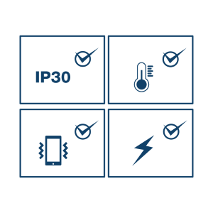 IP30 rated metal enclosure with a high degree of vibration and shock resistance, and a wide operating temperature range of -40° – 70° C (-40° – 158° F).
