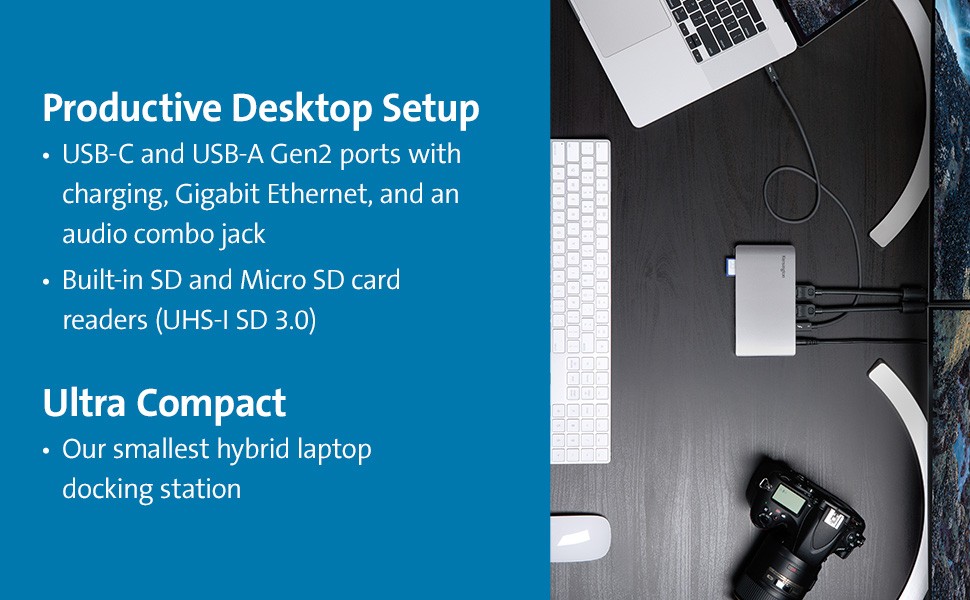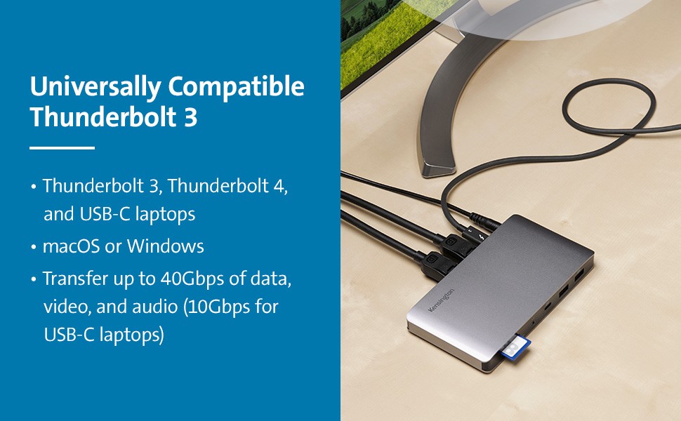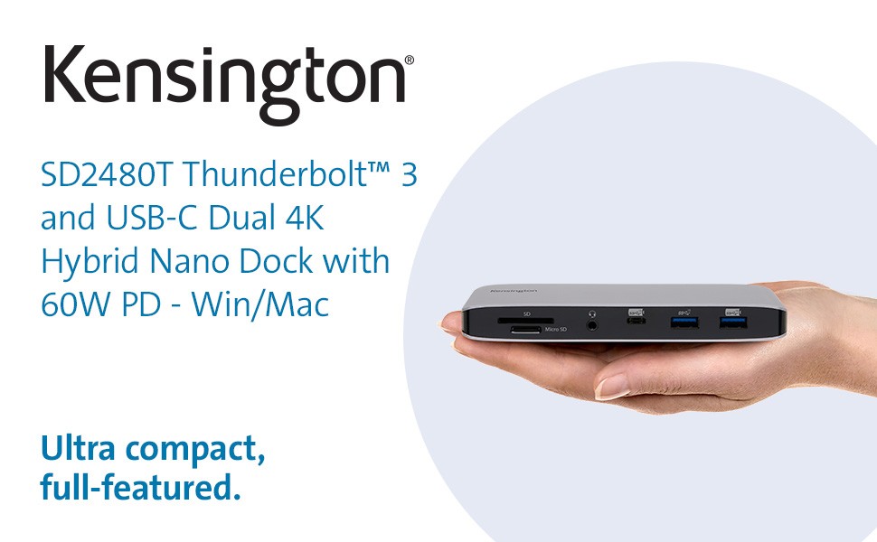 With the need for an affordable, full-featured Thunderbolt 3 desk dock that takes up little valuable desk space, the SD2480T Thunderbolt 3 and USB-C Dual 4K Hybrid Nano Dock with 60W PD - Win/Mac delivers. Built for office use, it’s the most compact 10-port Thunderbolt 3 laptop docking station, offering Single 8K or Dual 4K video @ 60Hz, 60W power delivery, 40Gbps data throughput, four USB ports, SD 3.0 UHS-I SD and Micro SD cards, Gigabit Ethernet, a combo audio jack; forward compatible with Thunderbolt 4 and backward compatible with USB-C laptops. Includes free Kensington DockWorks software.
