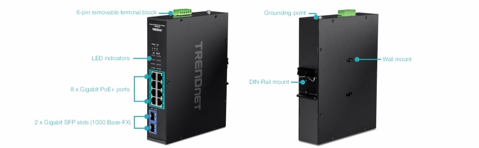 TRENDnet’s 10-Port Industrial Gigabit PoE+ DIN-Rail Switch -20° – 65°C (-4° – 149°F), model TI-PGM102, has eight gigabit PoE+ ports with a 240W PoE power budget, plus two gigabit SFP slots for long distance fiber applications. Users are able to connect eight PoE+ devices to the switch, while still providing two gigabit SFP slots for additional network connections. This switch is equipped with an IP30 rated metal enclosure, designed to operate within a wide temperature range of -20° – 65°C (-4° – 149°F) for harsh, industrial environments.