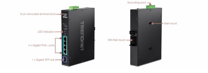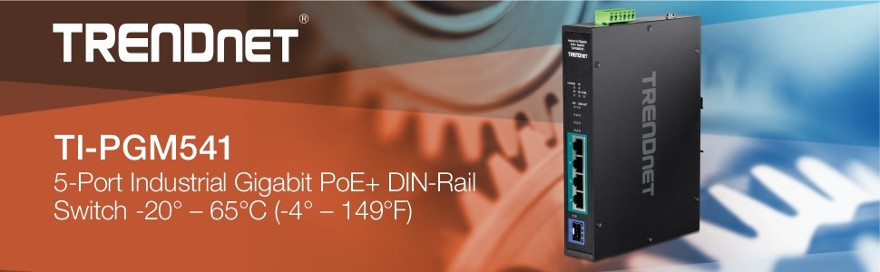 TRENDnet’s 5-Port Industrial Gigabit PoE+ DIN-Rail Switch -20° – 65°C (-4° – 149°F), model TI-PGM541, has four gigabit PoE+ ports with a 120W PoE power budget, plus one gigabit SFP slot for long distance fiber applications. Users are able to connect four PoE+ devices to the switch, while still providing one gigabit SFP slot for an additional network connection. This switch is equipped with an IP30 rated metal enclosure, designed to operate within a wide temperature range of -20° – 65°C (-4° – 149°F) for harsh, industrial environments.