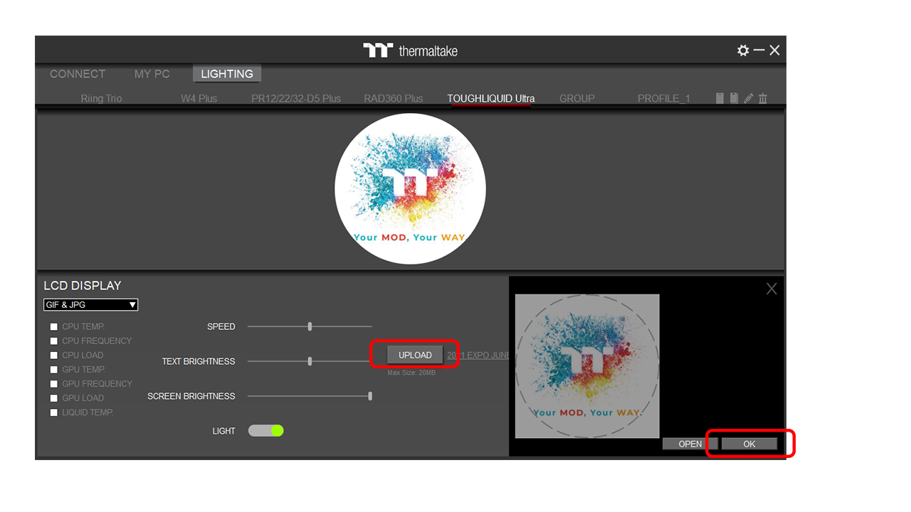 Monitor frequency and real-time temperature directly from our2.1 inch LCD Display, and upload any image or GIF file toadd extra flair with the TT RGB Plus 2.0 software.