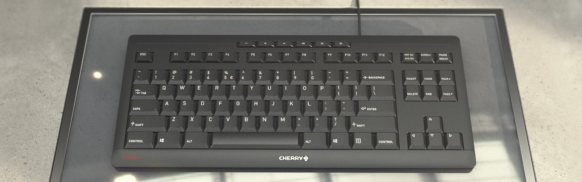 The STREAM KEYBOARD TKL is a compact corded keyboard perfect for saving desktop space or stowing for travel. The characteristic STREAM design - quiet and exceptional typing comfort is the result of CHERRY developed SX scissor design. There's no compromising with this smaller footprint alternative to the full-size STREAM KEYBOARD.