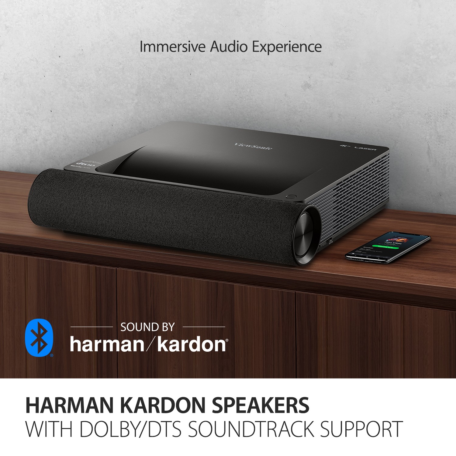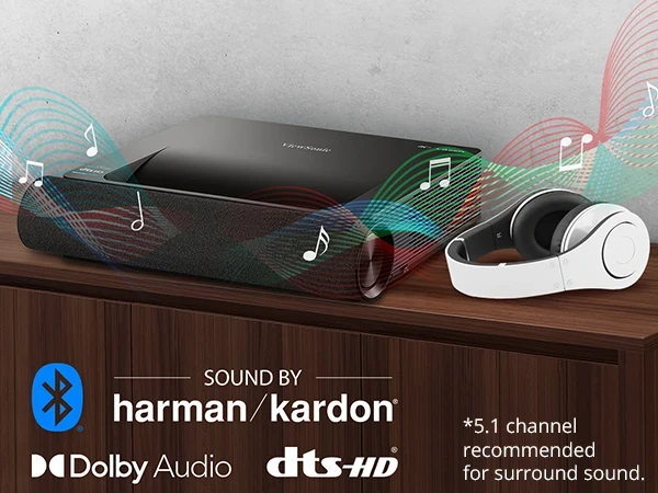 Dual integrated Harman Kardon 50W speakers deliver deep, loud, room-filling sound perfect for music and movies. Dolby and DTS support provides premium surround sound* with rich, clear and powerful audio reproduction for content ranging from broadcast, stream, download, disc and more. In addition, Bluetooth-in and Bluetooth-out enables you to use the projector as a Bluetooth soundbar or output the audio to your own Bluetooth headset.