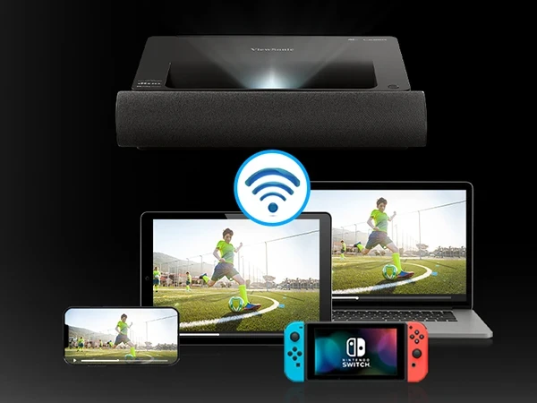 Embedded 5GHz high-speed Wi-Fi allows you to wirelessly share and stream videos and movies from compatible smartphones, tablets, and other mobile devices. In addition, Bluetooth-in and Bluetooth-out enables you to use the projector as a Bluetooth soundbar, or output the audio to your own Bluetooth headset.
