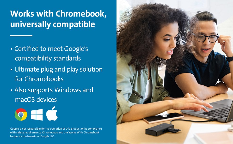 Take the worry out of knowing which dock is compatible with your Chromebook. The portable G1000P USB-C Mini Dock is certified to meet Google’s compatibility standards — it’s the ultimate plug-and-play solution for Chromebooks, while also compatible with Windows and macOS devices. Its compact form factor contains powerful connectivity options to extend productivity capabilities, with support for up to Single 4K @ 60Hz, 85W Pass-Through Charging, two USB-A 3.2 Gen1 5Gbps ports, one USB-C 3.2 port designed for power pass through only, and Gigabit Ethernet.