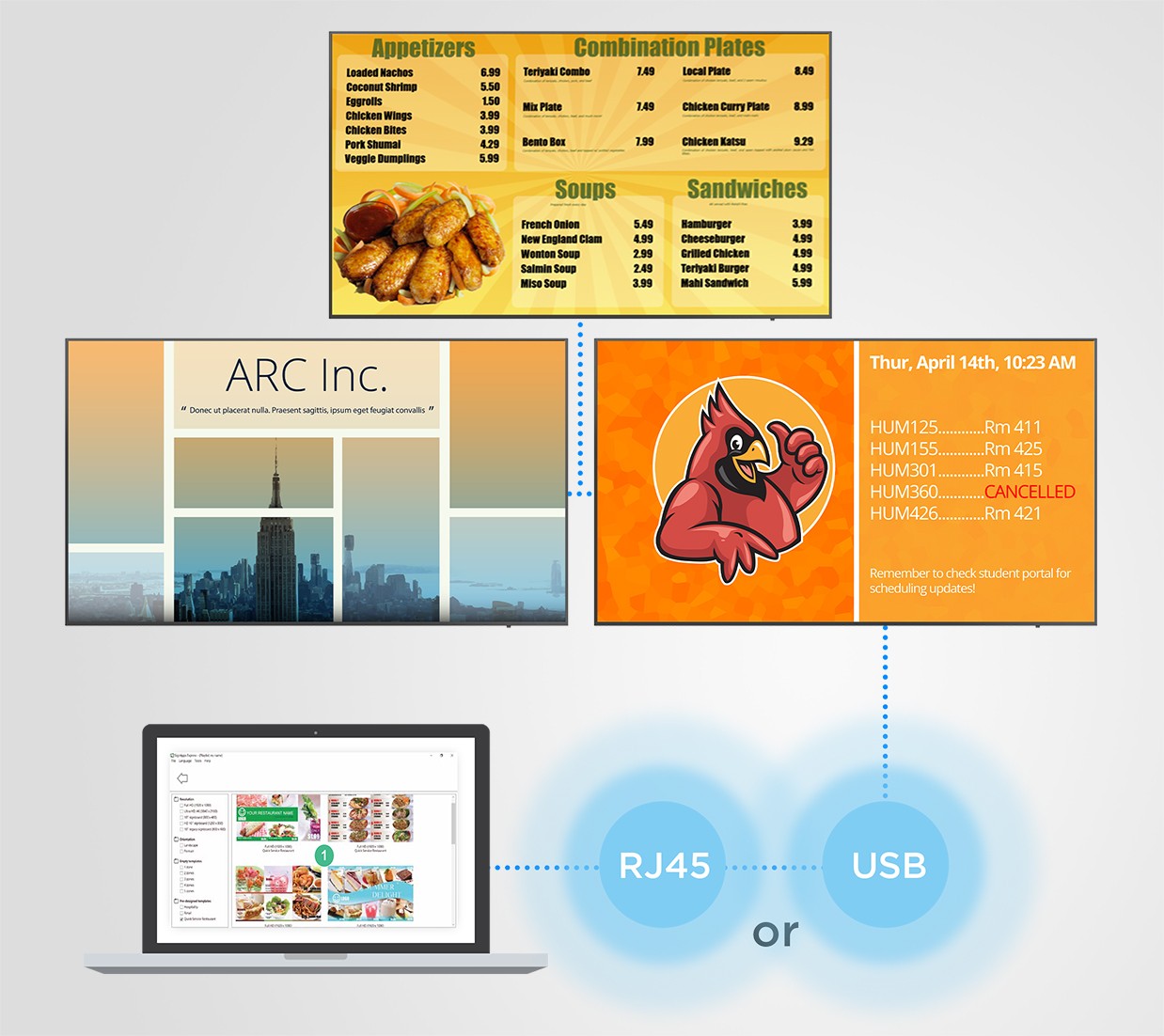 The optional Signage Manager (SW-216) software lets users transfer multimedia content onto the display from Windows PCs and laptops. This embedded content management tool also lets you format, schedule, and save playback settings. Push content with up to five zones via the local network or USB thumb drive.
