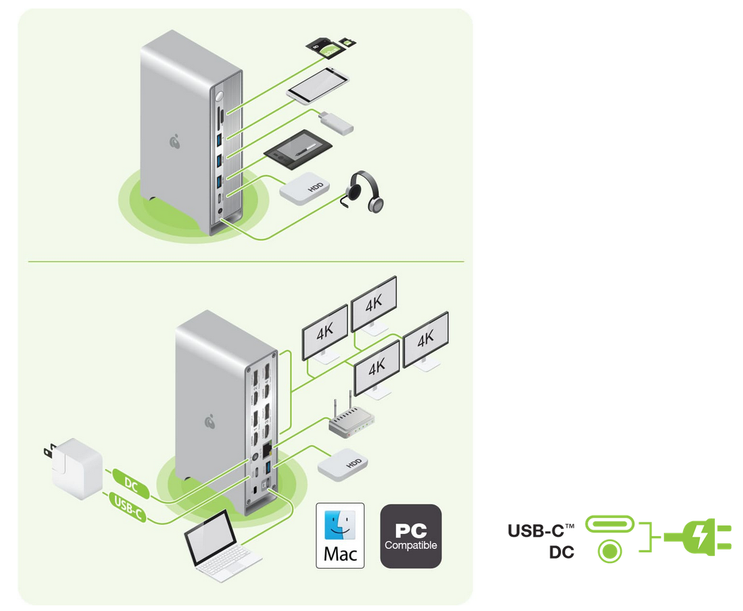 Designed for true power users, the IOGEAR Dock Pro ™ Universal 4K Docking Station is the ultimate work from home professional accessory. Connect to four 4K monitors with interchangeable HDMI® and DisplayPort port connections without the need for additional video adapters. With built-in USB-A and USB-C, easily connect to five high-performance devices. Take advantage of the true potential of any Windows or Mac laptop with Gigabit Ethernet port, SD/Micro SD reader and audio port.