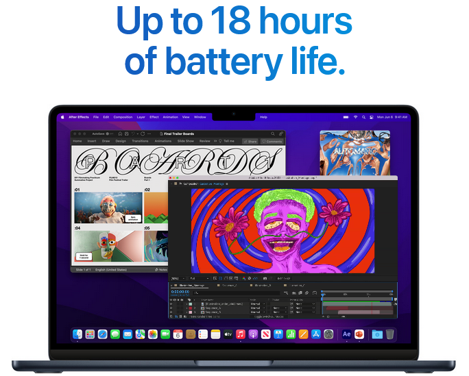 The M2 chip starts the next generation of Apple silicon, with even more of the speed and power efficiency of M1. So you can get more done faster with a more powerful 8‑core CPU. Create captivating images and animations with up to a 10-core GPU. Work with more streams of 4K and 8K ProRes video with the high‑performance media engine. And keep working — or playing — all day and into the night with up to 18 hours of battery life