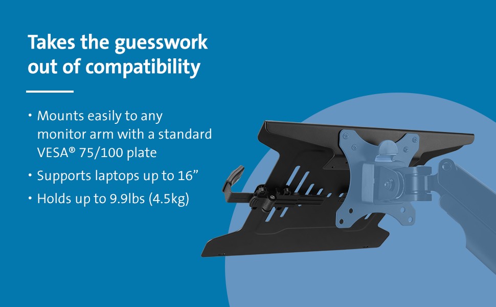 At home or in a traditional office, you want to be comfortable and productive. Many studies suggest that multiple monitors help increase productivity, including using your laptop as an additional screen. Easily raise or lower your laptop to an optimal viewing level and create an ideal desktop setup with the Universal Laptop Holder for Monitor Arms. Mounting easily to any monitor arm with a standard VESA 75/100 plate, the holder provides a stable and secure laptop platform that’s off the desk and out of the way. Strong but gentle clamps provide a stable and secure platform, freeing up valuable desk space.