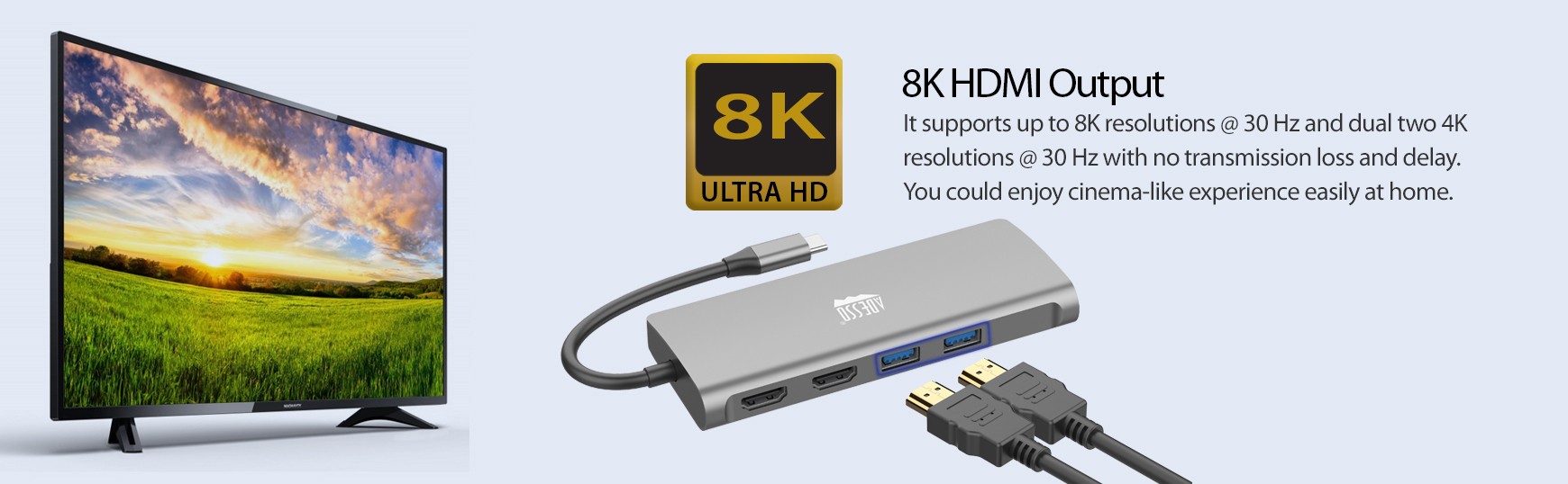 It supports up to 8K resolutions @ 30 Hz and dual two 4K resolutions @ 30 Hz with no transmission loss and delay. You could enjoy a cinema-like experience easily at home.