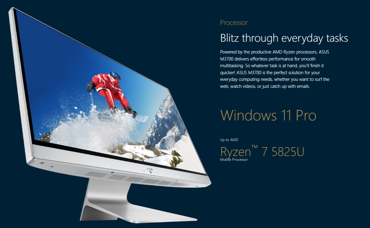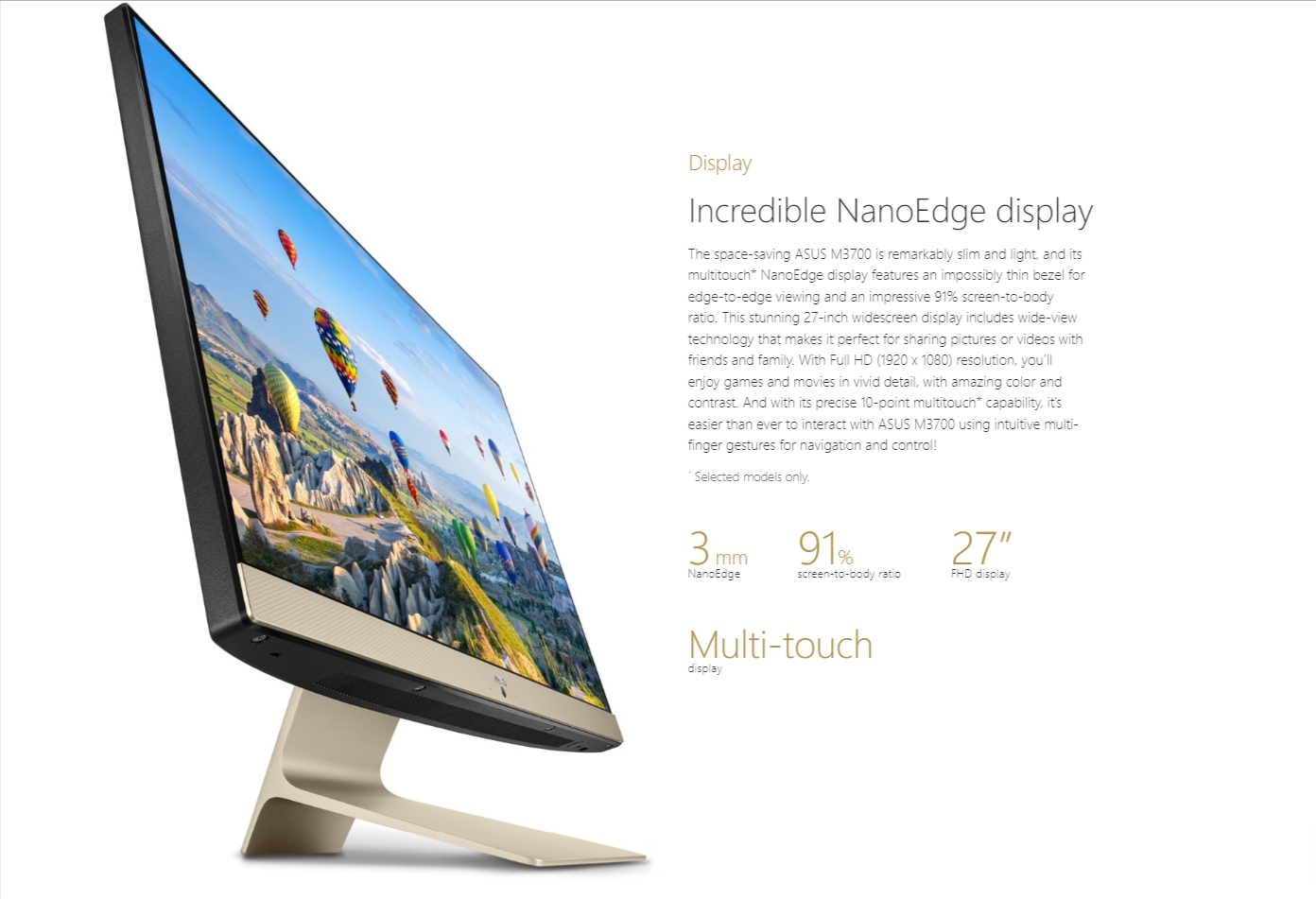 The NanoEdge display on ASUS M3700 features wide 178 ° viewing angles, and a wide 100% sRGB color gamut for vivid and realistic-looking colors. It also includes exclusive ASUS Splendid technology to ensure true-to-life colors — whether it’s an image of a sunset, a clear blue sky, or subtle skin tones.