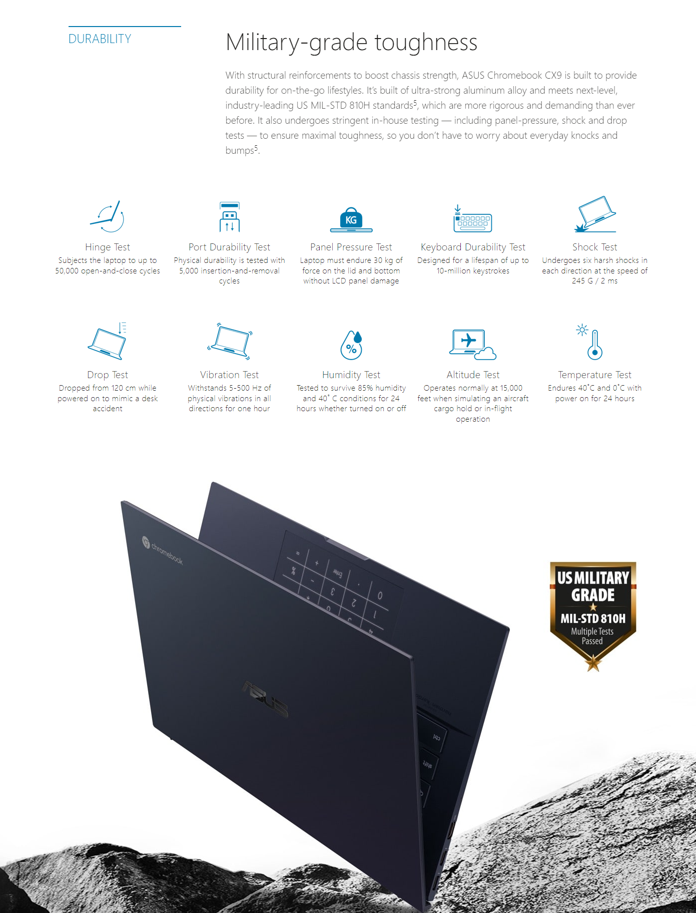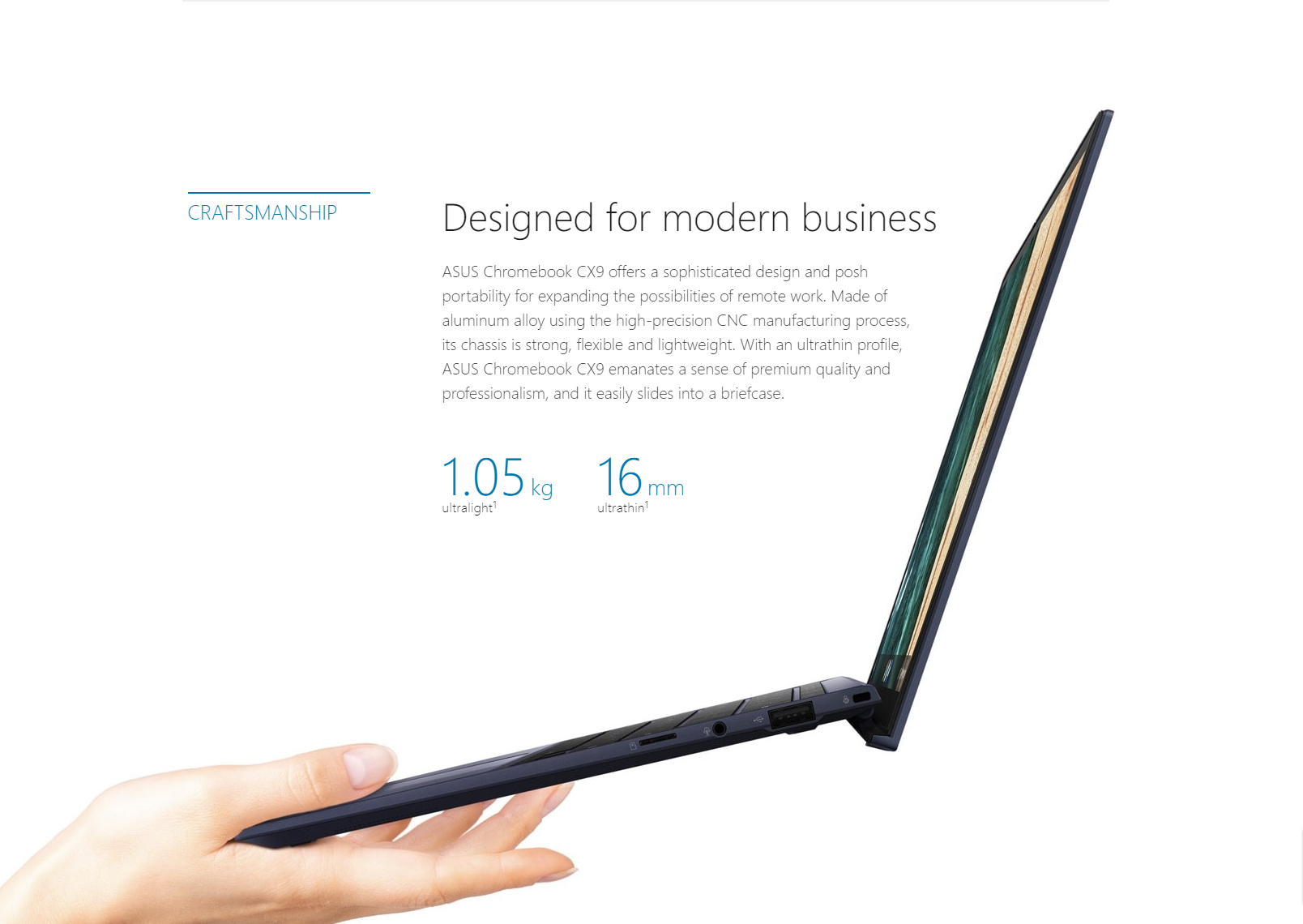 ASUS Chromebook CX9 is built for today’s fast-paced, constantly evolving business world — a world where many employees work remotely using cloud-first operating systems and collaborative tools such as Chrome OS. With an ultralight 1.05 kg 1 aluminum-alloy chassis and US MIL-STD 810H military-grade toughness, ASUS Chromebook CX9 delivers reliable take-anywhere mobility with the nimble performance of up to an 11th Gen lntel ® Core ™ i7 processor. It also features ultrafast WiFi 6, a Harman Kardon-certified dual-speaker audio system, a fingerprint sensor for password-free login 2 and up to a 4K UHD touchscreen display 3 — all to empower employees with the tools needed to get the job done efficiently and effectively, from anywhere.