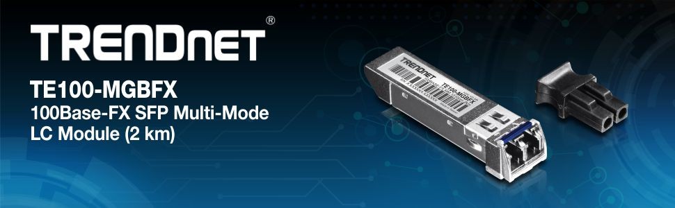 The 100Base-FX SFP Multi-Mode LC Module, model TE100-MGBFX, works with standard SFP (Mini-GBIC) slots on most switches and supports Multi-Mode network transmission speeds of up to 155 Mbps. The TE100-MGBFX is compatible with Duplex-LC fiber connector types and supports fiber optic connection distances of up to 2 kilometers (1.2 miles).
