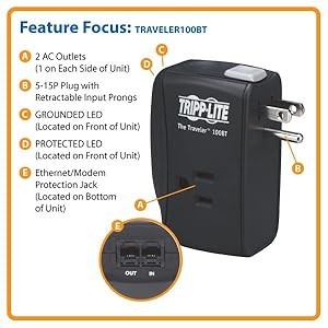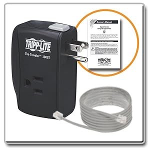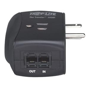 Dataline and network connections represent a potential back door through which a damaging surge can reach your equipment. The TRAVELER100BT includes one set of built-in RJ45/RJ11 combo jacks to prevent surges from damaging your network or dial up modem/fax/phone equipment (6 feet phone cord included).