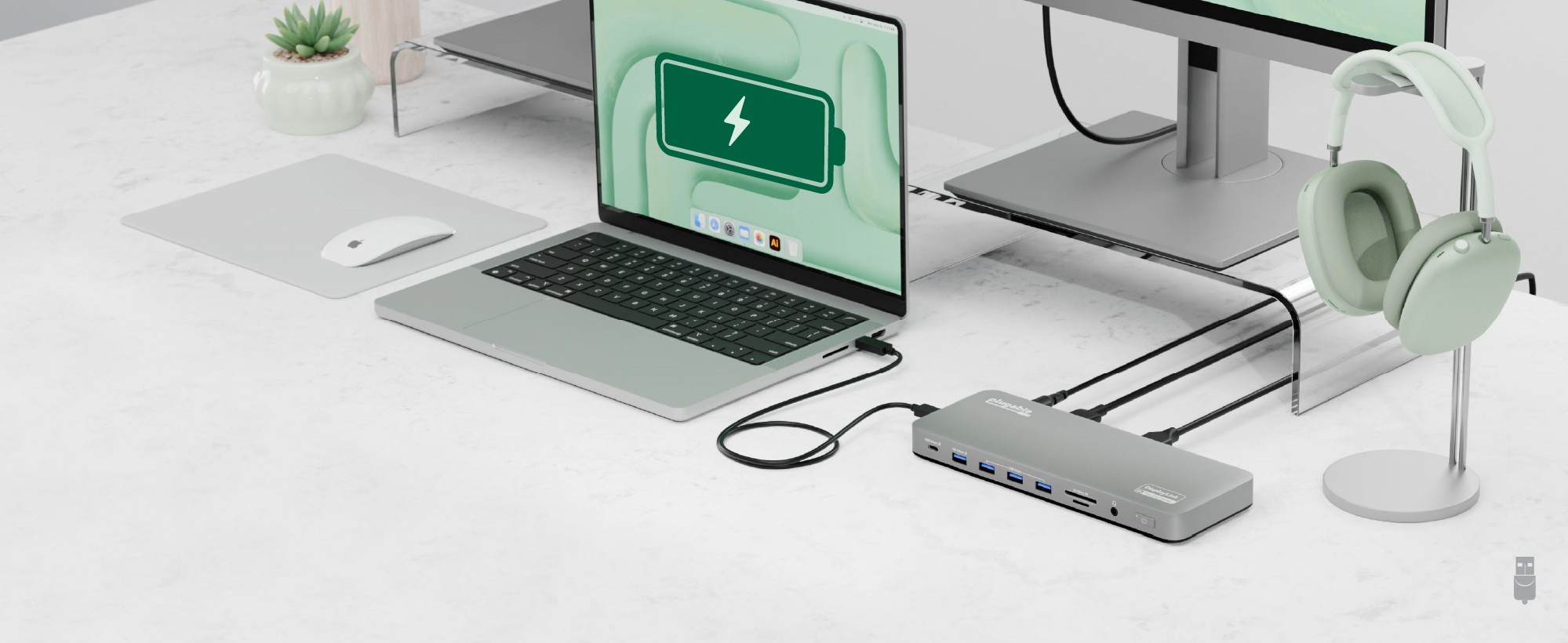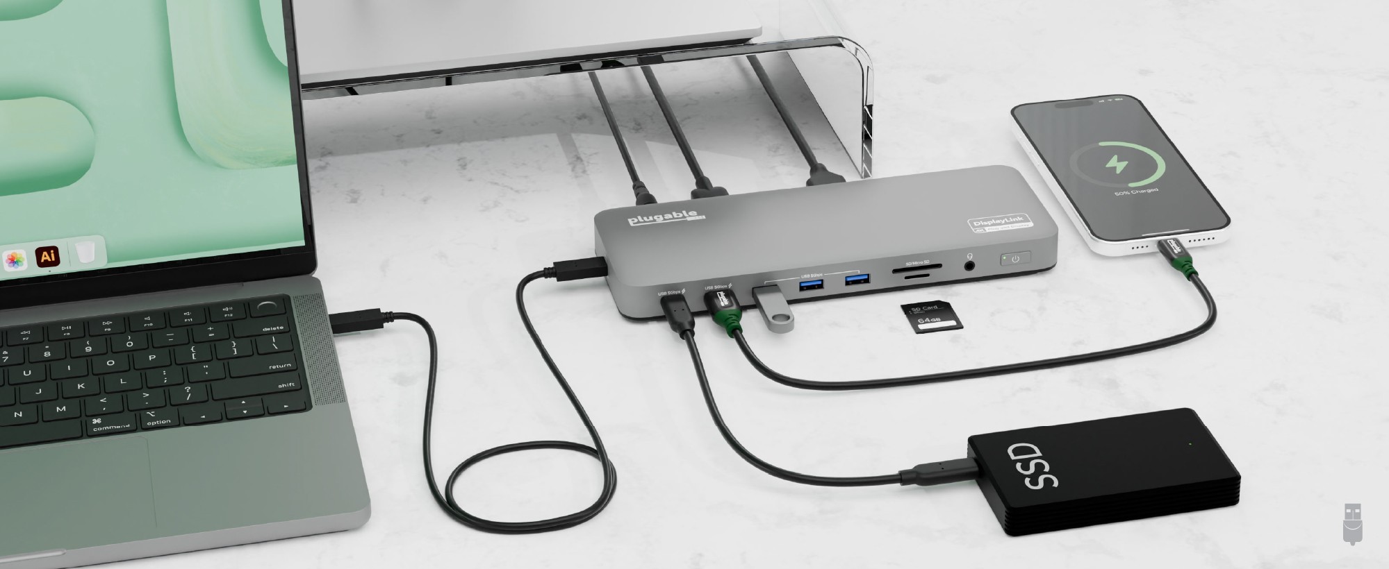 The front-facing USB-C and USB ports offer convenient charging, while three additional USB 3.0 ports ensure ample connectivity for all your peripherals. Integrated SD and microSD card readers provide quick access for memory cards, making it ideal for photographers and content creators. Additionally, the 3.5mm headset jack, reliable Ethernet port, and 100W power delivery keep you connected and powered up. Utilizing DisplayLink technology, this dock bypasses Mac display limitations, perfect for multitaskers using M1, M2, and M3 MacBooks, MacBook Air, and MacBook Pro models.