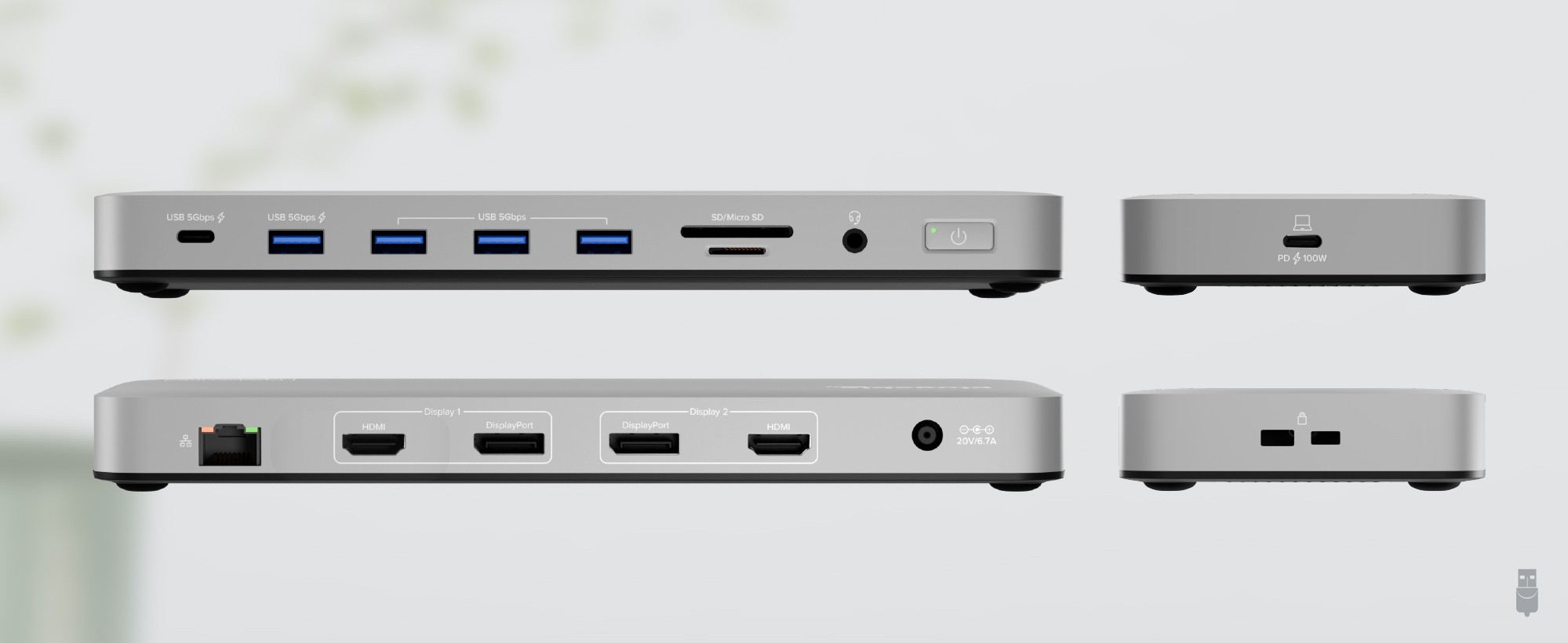 The 14-in-1 Dock for Mac features a aluminum casing with a space gray finish. This dock seamlessly integrates with your Mac to deliver exceptional performance. With 14 ports, including dual 4K monitor support via HDMI, DisplayPort or a mix of both, you can connect up to two screens at 4K 60Hz, even on Macs typically limited to a single extended monitor.