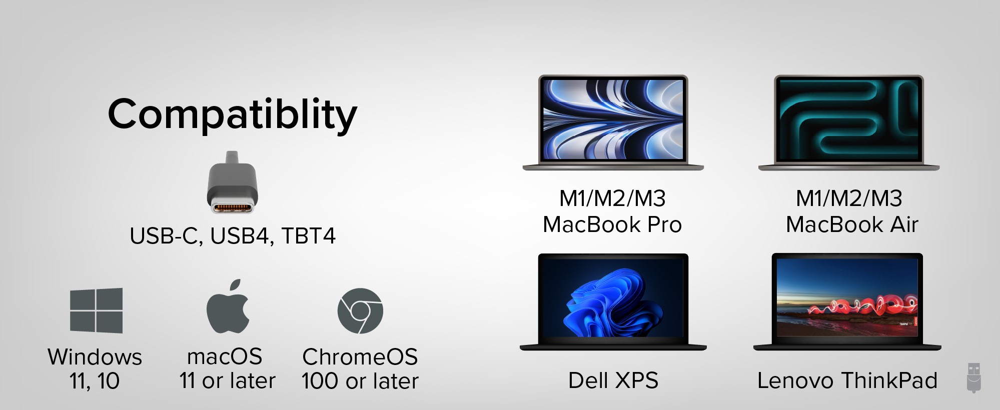 Compatible with macOS 11+, Windows 10+, and ChromeOS 100+ systems with Thunderbolt, USB4, or USB-C ports, this dock is designed for both traditional and hybrid office setups. Please note that driver installation is required to fully utilize its capabilities, and HDCP is not supported.